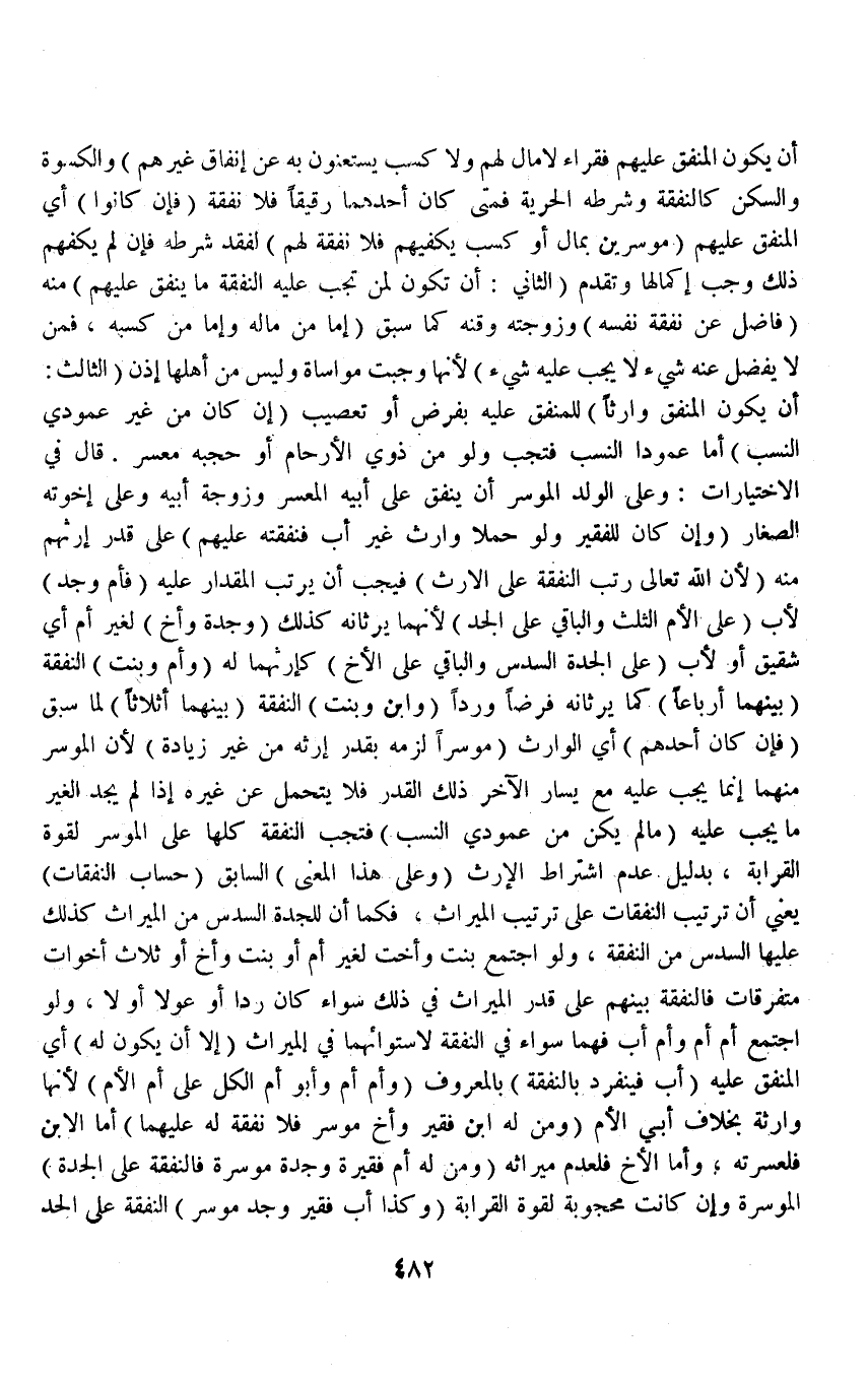 (الثَّانِي أَنْ تَكُونَ لِمَنْ تَجِبُ عَلَيْهِ النَّفَقَةُ مَا يُنْفَقُ عَلَيْهِمْ) مِنْهُ (فَاضِلًا عَنْ نَفَقَةِ نَفْسِهِ) وَزَوْجَتِهِ وَقَنِّهِ كَمَا سَبَقَ (إمَّا مِنْ مَالِهِ وَإِمَّا مِنْ كَسْبِهِ، فَمَنْ لَا يَفْضُلُ عَنْهُ شَيْءٌ لَا يَجِبُ عَلَيْهِ شَيْءٌ) لِأَنَّهَا وَجَبَتْ مُوَاسَاةً وَلَيْسَ مِنْ أَهْلِهَا إذَنْ (الثَّالِثُ أَنْ يَكُونَ الْمُنْفِقُ وَارِثًا) لِلْمُنْفَقِ عَلَيْهِ بِفَرْضٍ أَوْ تَعْصِيبٍ (إنْ كَانَ مِنْ غَيْرِ عَمُودِيِّ النَّسَبِ) أَمَّا عَمُودًا النَّسَبِ فَتَجِبُ وَلَوْ مِنْ ذَوِي الْأَرْحَامِ أَوْ حَجَبَهُ مُعْسِرٌ قَالَ فِي الِاخْتِيَارَاتِ: وَعَلَى الْوَلَدِ الْمُوسِرِ أَنْ يُنْفَقَ عَلَى أَبِيهِ الْمُعْسِرِ وَزَوْجَةِ أَبِيهِ وَعَلَى إخْوَتِهِ الصِّغَارِ.