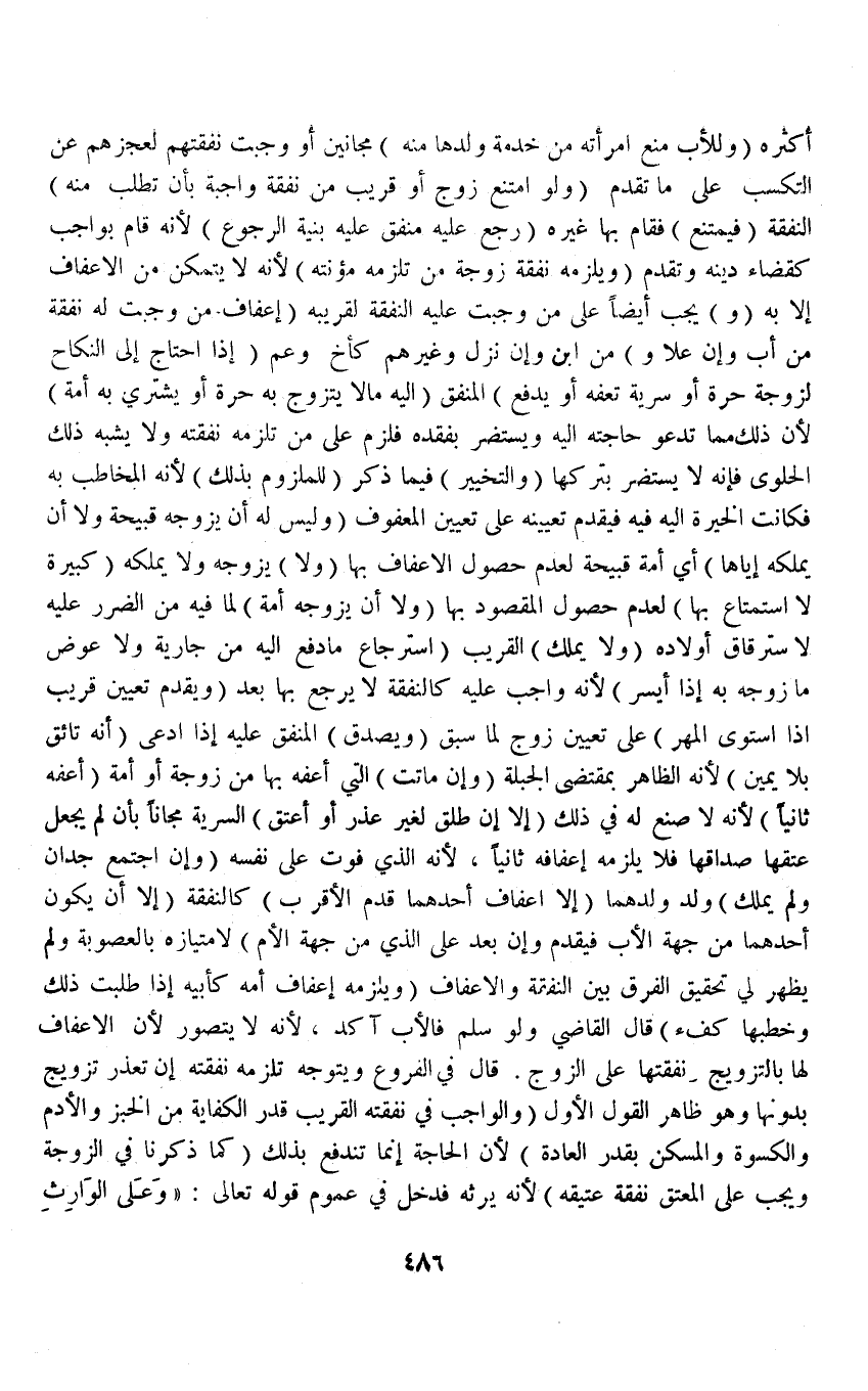 (وَ) يَجِبُ أَيْضًا (عَلَى مَنْ وَجَبَتْ عَلَيْهِ النَّفَقَةُ لِقَرِيبِهِ إعْفَافُ مَنْ وَجَبَتْ لَهُ نَفَقَةٌ مِنْ أَبٍ وَإِنْ عَلَا وَ) مِنْ ابْنٍ وَإِنْ نَزَلَ وَغَيْرِهِمْ كَأَخٍ وَعَمٍّ (إذَا احْتَاجَ إلَى النِّكَاحِ لِزَوْجَةٍ حُرَّةٍ أَوْ سُرِّيَّةٍ تُعِفُّهُ أَوْ يَدْفَعُ) الْمُنْفِقُ إلَيْهِ مَالًا يَتَزَوَّجُ بِهِ حُرَّةً أَوْ يَشْتَرِي بِهِ أَمَةً لِأَنَّ ذَلِكَ مِمَّا تَدْعُو حَاجَتُهُ إلَيْهِ وَيُسْتَضَرُّ بِفَقْدِهِ فَلَزِمَ عَلَى مَنْ تَلْزَمُهُ نَفَقَتُهُ وَلَا يُشْبِهُ ذَلِكَ الْحَلْوَى فَإِنَّهُ لَا يُسْتَضَرُّ بِتَرْكِهَا (وَالتَّخْيِيرُ) فِيمَا ذُكِرَ (لِلْمَلْزُومِ بِذَلِكَ) لِأَنَّهُ الْمُخَاطَبُ بِهِ فَكَانَتْ الْخِيَرَةُ إلَيْهِ فِيهِ فَيُقَدِّمُ تَعْيِينَهُ عَلَى تَعْيِينِ الْمَعْفُوفِ.