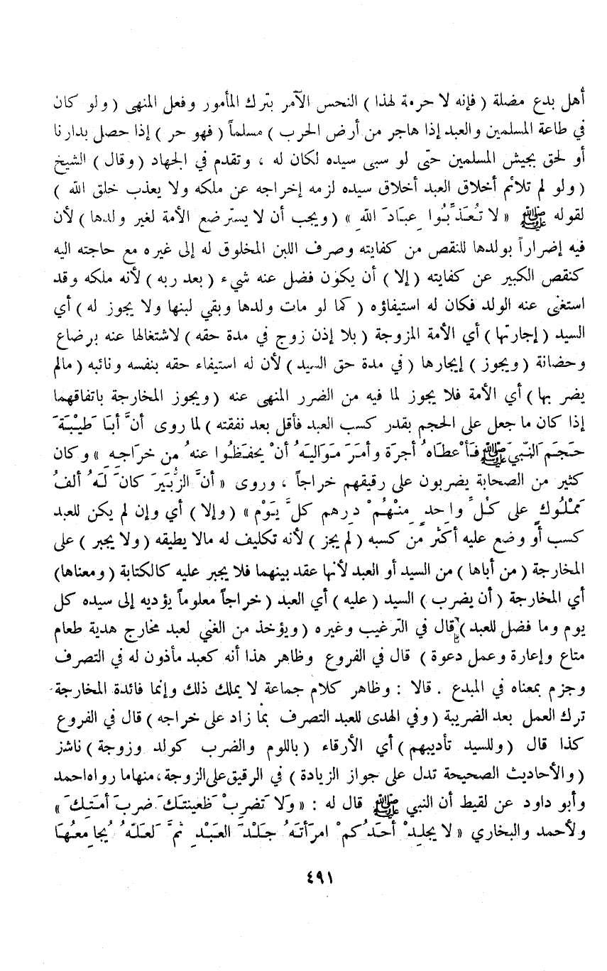 قَالَ فِي الْفُرُوعِ كَذَا قَالَ (وَلِلسَّيِّدِ تَأْدِيبُهُمْ) أَيْ الْأَرِقَّاءِ (بِاللَّوْمِ وَالضَّرْبِ كَوَلَدٍ وَزَوْجَةٍ) نَاشِزٍ (وَالْأَحَادِيثُ الصَّحِيحَةُ تَدُلُّ عَلَى جَوَازِ الزِّيَادَةِ) فِي الرَّقِيقِ عَلَى الزَّوْجَةِ، مِنْهَا مَا رَوَاهُ أَحْمَدُ وَأَبُو دَاوُد عَنْ لَقِيطٍ أَنَّ النَّبِيَّ - صَلَّى اللَّهُ عَلَيْهِ وَسَلَّمَ - قَالَ لَهُ: «وَلَا تَضْرِبْ ظَعِينَتَكَ ضَرْبَ أَمَتِكَ» وَلِأَحْمَدَ وَالْبُخَارِيِّ «لَا يَجْلِدْ أَحَدُكُمْ امْرَأَتَهُ جَلْدَ الْعَبْدِ ثُمَّ لَعَلَّهُ يُجَامِعُهَا