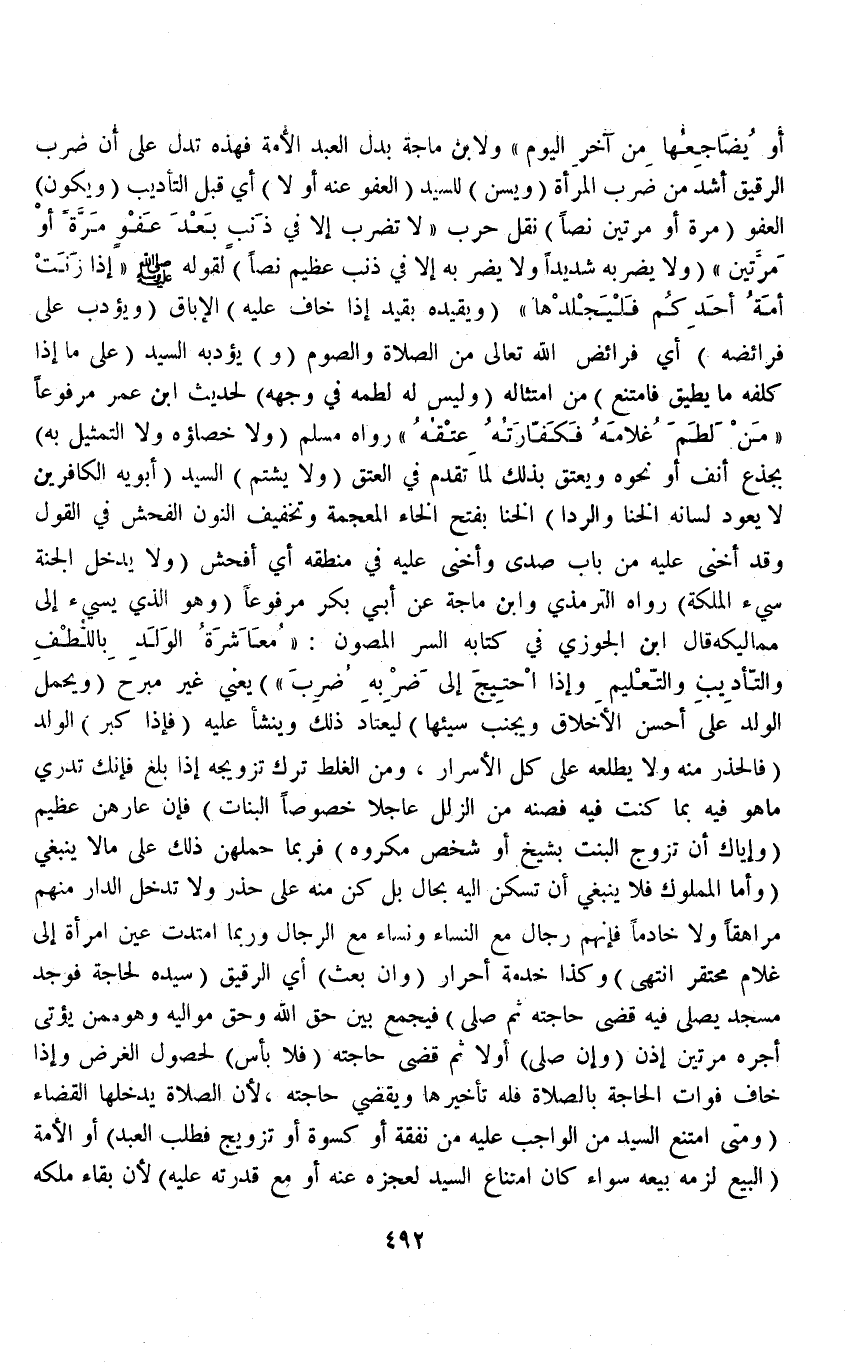 أَوْ يُضَاجِعُهَا مِنْ آخِرِ الْيَوْمِ» وَلِابْنِ مَاجَهْ بَدَلَ الْعَبْدِ الْأَمَةُ فَهَذِهِ تَدُلُّ عَلَى أَنَّ ضَرْبَ الرَّقِيقِ أَشَدُّ مِنْ ضَرْبِ الْمَرْأَةِ (وَيُسَنُّ) لِلسَّيِّدِ (الْعَفْوُ عَنْهُ أَوْ لَا) أَيْ قَبْلَ التَّأْدِيبِ (وَيَكُونُ) الْعَفْوُ (مَرَّةً أَوْ مَرَّتَيْنِ نَصًّا) نَقَلَ حَرْبٌ " لَا تَضْرِبْ إلَّا فِي ذَنْبٍ بَعْدَ عَفْوٍ مَرَّةً أَوْ مَرَّتَيْنِ " (وَلَا يَضْرِبُهُ شَدِيدًا وَلَا يَضْرِبُهُ إلَّا فِي ذَنْبٍ عَظِيمٍ نَصًّا) لِقَوْلِهِ - صَلَّى اللَّهُ عَلَيْهِ وَسَلَّمَ - «إذَا زَنَتْ أَمَةُ أَحَدِكُمْ فَلْيَجْلِدْهَا» (وَيُقَيِّدُهُ بِقَيْدٍ إذَا خَافَ عَلَيْهِ) الْإِبَاقَ (وَيُؤَدَّبُ عَلَى فَرَائِضِهِ) أَيْ فَرَائِضِ اللَّهِ تَعَالَى مِنْ الصَّلَاةِ وَالصَّوْمِ.