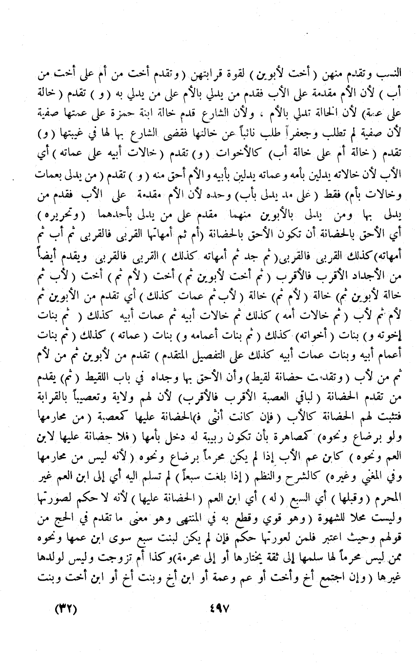 (وَتَحْرِيرُهُ) أَيْ الْأَحَقِّ بِالْحَضَانَةِ أَنْ تَكُونَ الْأَحَقُّ بِالْحَضَانَةِ (أُمٌّ ثُمَّ أُمَّهَاتُهَا الْقُرْبَى فَالْقُرْبَى ثُمَّ أَبٌ ثُمَّ أُمَّهَاتُهُ) كَذَلِكَ الْقُرْبَى فَالْقُرْبَى (ثُمَّ جَدٌّ ثُمَّ أُمَّهَاتُهُ كَذَلِكَ) الْقُرْبَى فَالْقُرْبَى، وَيُقَدَّمُ أَيْضًا مِنْ الْأَجْدَادِ الْأَقْرَبُ فَالْأَقْرَبُ (ثُمَّ أُخْتٌ لِأَبَوَيْنِ ثُمَّ) (أُخْتٌ لِأُمٍّ ثُمَّ) أُخْتٌ (لِأَبٍ ثُمَّ خَالَةٌ لِأَبَوَيْنِ ثُمَّ) خَالَةٌ (لِأُمٍّ ثُمَّ) خَالَةٌ (لِأَبٍ ثُمَّ عَمَّاتٌ كَذَلِكَ) أَيْ تُقَدَّمُ مِنْ الْأَبَوَيْنِ ثُمَّ لِأُمٍّ ثُمَّ لِأَبٍ (ثُمَّ خَالَاتُ أُمِّهِ) كَذَلِكَ ثُمَّ خَالَاتُ أَبِيهِ ثُمَّ عَمَّاتُ أَبِيهِ كَذَلِكَ (ثُمَّ بَنَاتُ إخْوَتِهِ وَ) بَنَاتُ (أَخَوَاتِهِ) كَذَلِكَ (ثُمَّ بَنَاتُ أَعْمَامِهِ وَ) بَنَاتُ عَمَّاتِهِ كَذَلِكَ (ثُمَّ بَنَاتُ أَعْمَامِ أَبِيهِ وَبَنَاتُ عَمَّاتِ أَبِيهِ كَذَلِكَ عَلَى التَّفْصِيلِ الْمُتَقَدِّمِ) تُقَدَّمُ مَنْ لِأَبَوَيْنِ ثُمَّ مَنْ لِأُمٍّ ثَمَّ مَنْ لِأَبٍ.