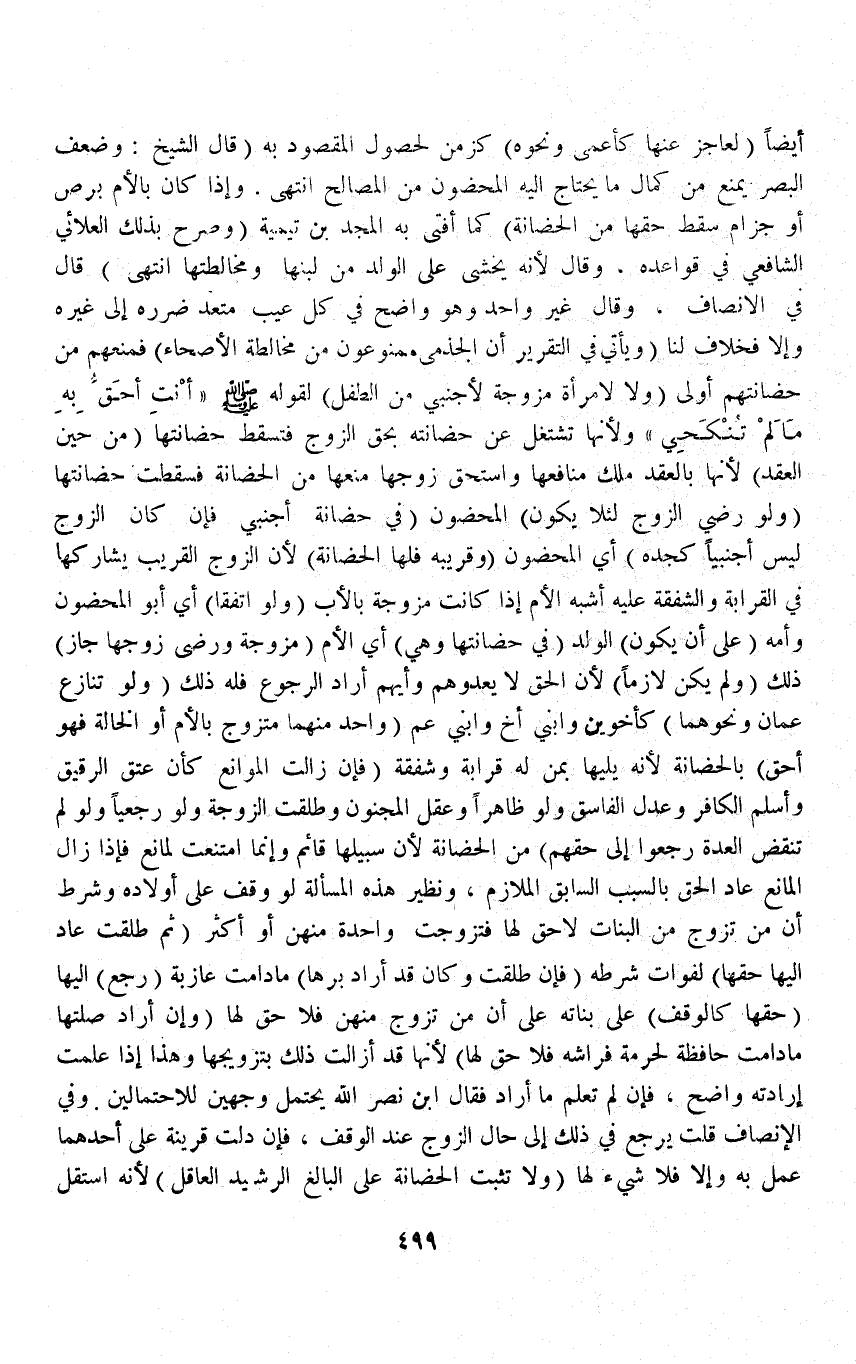 (قَالَ الشَّيْخُ: وَضَعْفُ الْبَصَرِ يَمْنَعُ مِنْ كَمَالِ مَا يَحْتَاجُ إلَيْهِ الْمَحْضُونُ مِنْ الْمَصَالِحِ) انْتَهَى.