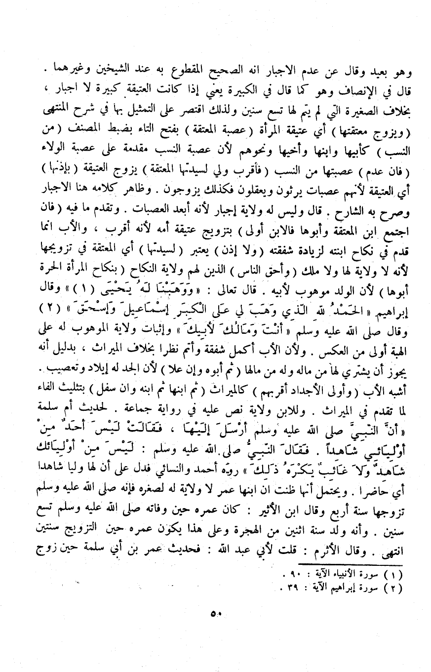 وَهُوَ بَعِيدٌ وَقَالَ عَنْ عَدَمِ الْإِجْبَارِ إنَّهُ الصَّحِيحُ الْمَقْطُوعُ بِهِ عِنْدَ الشَّيْخَيْنِ وَغَيْرِهِمَا قَالَ فِي الْإِنْصَافِ وَهُوَ كَمَا قَالَ فِي الْكَبِيرَةِ يَعْنِي إذَا كَانَتْ الْعَتِيقَةُ كَبِيرَةً لَا إجْبَارَ بِخِلَافِ الصَّغِيرَةِ الَّتِي لَمْ يَتِمَّ لَهَا تِسْعُ سِنِينَ وَلِذَلِكَ اقْتَصَرَ عَلَى التَّمْثِيلِ بِهَا فِي شَرْحِ الْمُنْتَهَى.