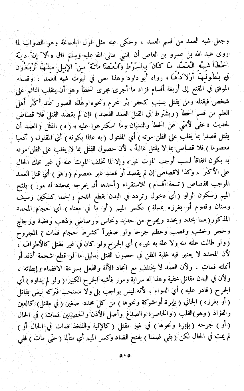وَجَعَلَ شِبْهَ الْعَمْدِ مِنْ قِسْمِ الْعَمْدِ، وَحُكِيَ عَنْهُ مِثْلُ قَوْلِ الْجَمَاعَةِ، وَهُوَ الصَّوَابُ لِمَا رَوَى عَبْدُ اللَّهِ بْنُ عَمْرِو بْنِ الْعَاصِ أَنَّ النَّبِيَّ قَالَ: «أَلَا إنَّ دِيَةَ الْخَطَإِ شِبْهِ الْعَمْدِ مَا كَانَ بِالسَّوْطِ وَالْعَصَا مِائَةٌ مِنْ الْإِبِلِ مِنْهَا أَرْبَعُونَ فِي بُطُونِهَا أَوْلَادُهَا» رَوَاهُ أَبُو دَاوُد وَهَذَا نَصٌّ فِي ثُبُوتِ شِبْهِ الْعَمْدِ.