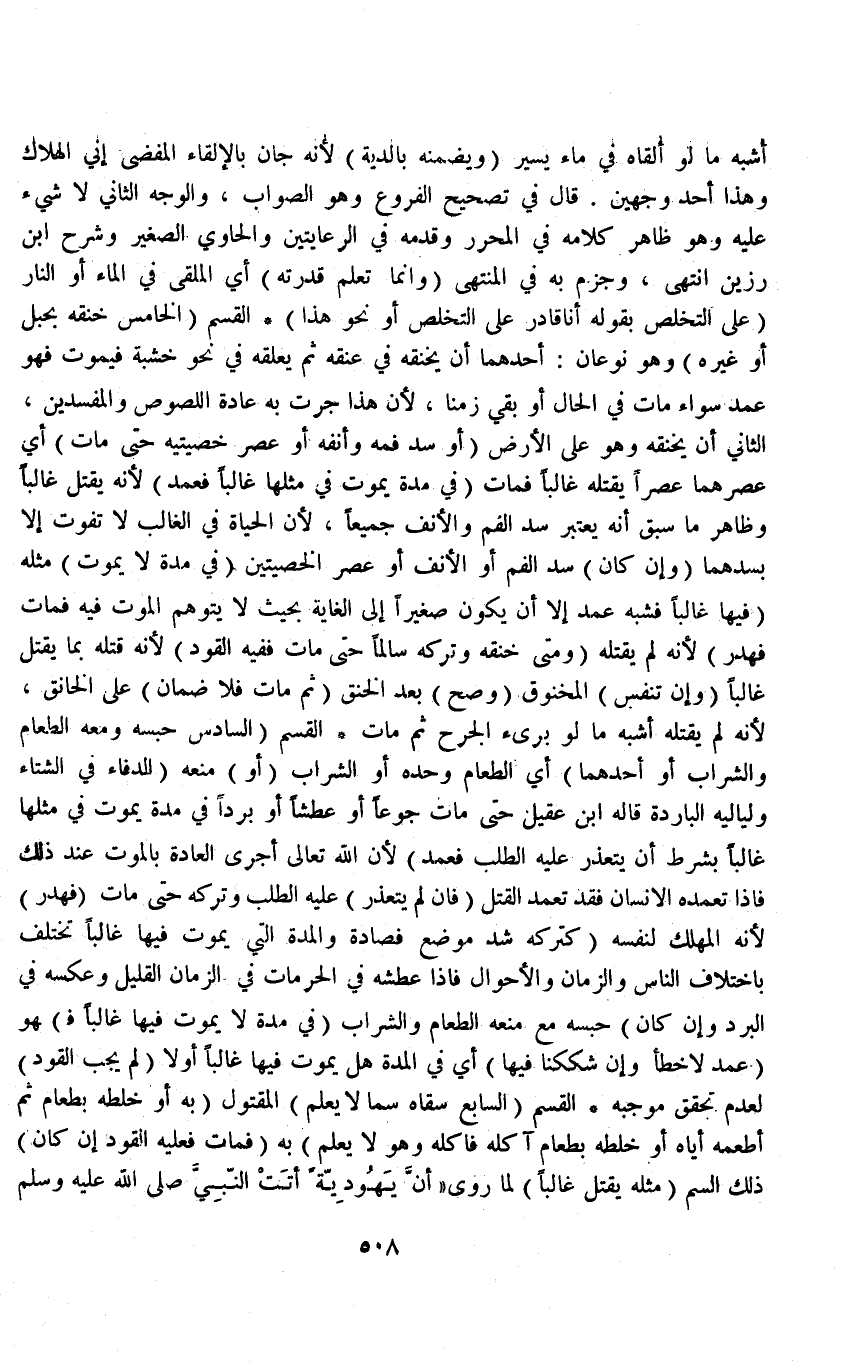 الْقِسْمُ (السَّادِسُ حَبَسَهُ وَمَعَهُ الطَّعَامُ وَالشَّرَابُ أَوْ أَحَدُهُمَا) أَيْ الطَّعَامُ وَحْدَهُ أَوْ الشَّرَابُ (أَوْ) مَنَعَهُ (الدِّفَاءَ فِي الشِّتَاءِ وَلَيَالِيهِ الْبَارِدَةِ، قَالَهُ ابْنُ عَقِيلٍ حَتَّى مَاتَ جُوعًا أَوْ عَطَشًا أَوْ بَرْدًا فِي مُدَّةٍ يَمُوتُ فِي مِثْلِهَا غَالِبًا بِشَرْطِ أَنْ يَتَعَذَّرَ عَلَيْهِ الطَّلَبُ فَعَمْدٌ) لِأَنَّ اللَّهَ تَعَالَى أَجْرَى الْعَادَةَ بِالْمَوْتِ عِنْدَ ذَلِكَ فَإِذَا تَعَمَّدَهُ الْإِنْسَانُ فَقَدْ تَعَمَّدَ الْقَتْلَ (فَإِنْ لَمْ يَتَعَذَّرْ) عَلَيْهِ الطَّلَبُ وَتَرَكَهُ حَتَّى مَاتَ (فَهَدَرٌ) لِأَنَّهُ الْمُهْلِكُ لِنَفْسِهِ (كَتَرْكِهِ شَدَّ مَوْضِعِ فِصَادِهِ، وَالْمُدَّةُ الَّتِي يَمُوتُ فِيهَا غَالِبًا تَخْتَلِفُ بِاخْتِلَافِ النَّاسِ وَالزَّمَانِ وَالْأَحْوَالِ؛ فَإِذَا عَطِشَ فِي الْحَرِّ مَاتَ فِي الزَّمَانِ الْقَلِيلِ وَعَكْسُهُ فِي الْبَرْدِ وَإِنْ كَانَ) حَبَسَهُ مَعَ مَنْعِهِ الطَّعَامَ وَالشَّرَابَ (فِي مُدَّةٍ لَا يَمُوتُ فِيهَا غَالِبًا فَ) هُوَ (عَمْدٌ لَا خَطَأٌ وَإِنْ شَكَكْنَا فِيهَا) أَيْ فِي الْمُدَّةِ هَلْ يَمُوتُ فِيهَا غَالِبًا أَوْ لَا؟ (لَمْ يَجِبْ الْقَوَدُ) لِعَدَمِ تَحَقُّقِ مُوجِبِهِ.
