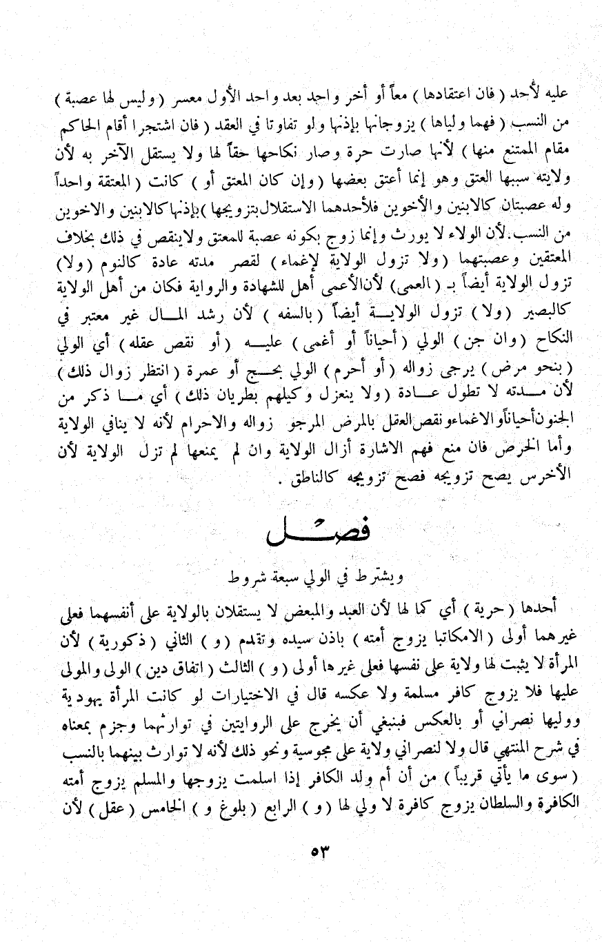 (فَصْلٌ وَيُشْتَرَطُ فِي الْوَلِيِّ) سَبْعَةُ شُرُوطٍ أَحَدُهَا: (حُرِّيَّةٌ) أَيْ كَمَالُهَا لِأَنَّ الْعَبْدَ وَالْمُبَعَّضِ لَا يَسْتَقِلَّانِ بِالْوِلَايَةِ عَلَى أَنْفُسِهِمَا فَعَلَى غَيْرِهِمَا أَوْلَى (إلَّا مُكَاتَبًا يُزَوِّجُ أَمَتَهُ) بِإِذْنِ سَيِّدِهِ، وَتَقَدَّمَ.
