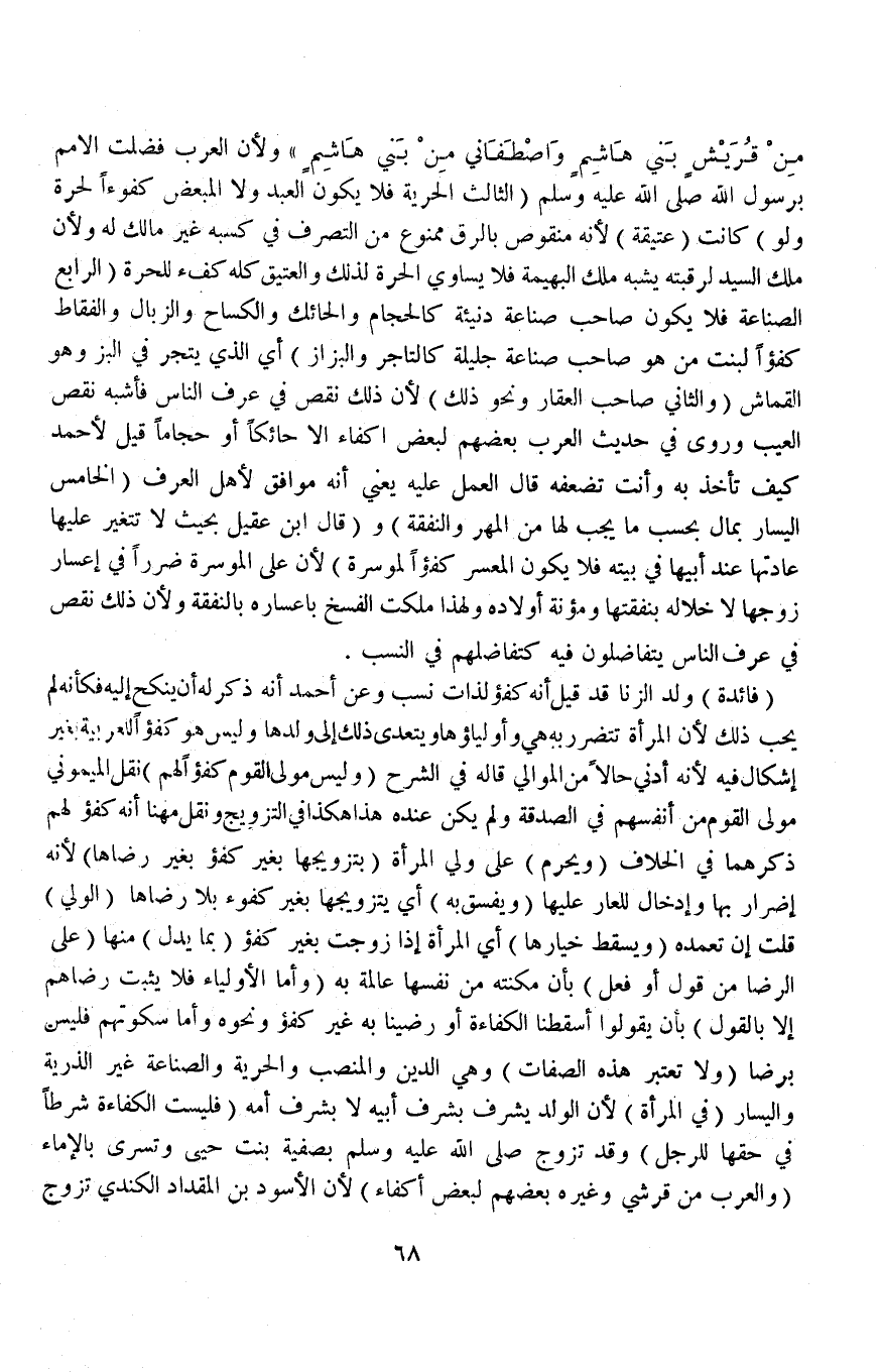 مِنْ قُرَيْشٍ بَنِي هَاشِمٍ وَاصْطَفَانِي مِنْ بَنِي هَاشِمٍ» وَلِأَنَّ الْعَرَبَ فَضَلَتْ الْأُمَمَ بِرَسُولِ اللَّهِ - صَلَّى اللَّهُ عَلَيْهِ وَسَلَّمَ - (الثَّالِثُ الْحُرِّيَّةُ فَلَا يَكُونُ الْعَبْدُ وَلَا الْمُبَعَّضُ كُفُئًا لِحُرَّةٍ وَلَوْ) كَانَتْ (عَتِيقَةً) لِأَنَّهُ مَنْقُوصٌ بِالرِّقِّ مَمْنُوعٌ مِنْ التَّصَرُّفِ فِي كَسْبِهِ غَيْرُ مَالِكٍ لَهُ وَلِأَنَّ مِلْكَ السَّيِّدِ لِرَقَبَتِهِ يُشْبِهُ مِلْكَ الْبَهِيمَةِ فَلَا يُسَاوِي الْحُرَّةَ لِذَلِكَ وَالْعَتِيقُ كُلُّهُ كُفْءٌ لِلْحُرَّةِ.
