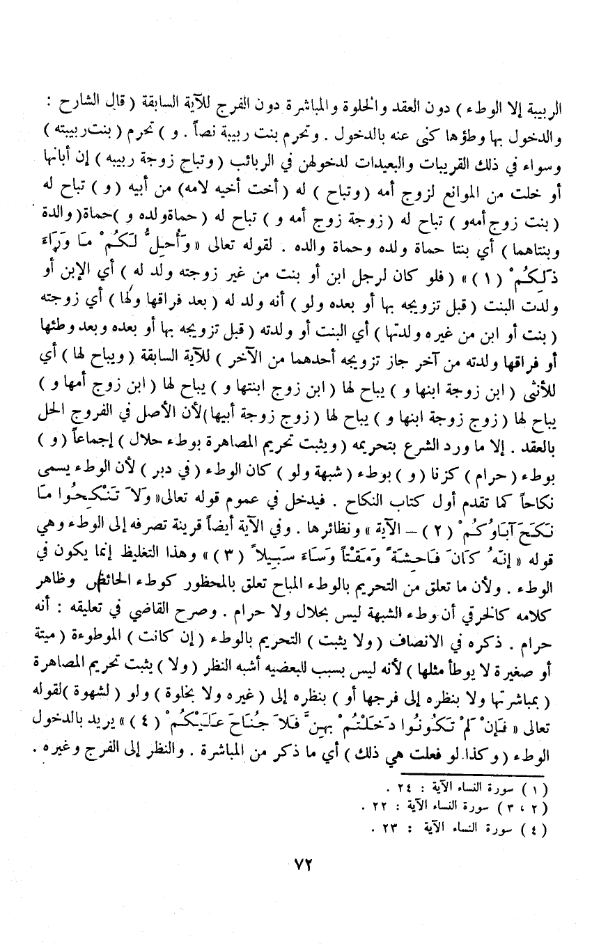 وَفِي الْآيَةِ أَيْضًا قَرِينَةٌ تَصْرِفهُ إلَى الْوَطْءِ وَهِيَ قَوْلُهُ {إِنَّهُ كَانَ فَاحِشَةً وَمَقْتًا وَسَاءَ سَبِيلا} [النساء: ٢٢] (٣) وَهَذَا التَّغْلِيظُ إنَّمَا يَكُونُ فِي الْوَطْءِ وَلِأَنَّ مَا تَعَلَّقَ مِنْ التَّحْرِيمِ بِالْوَطْءِ الْمُبَاحِ تَعَلَّقَ بِالْمَحْظُورِ كَوَطْءِ الْحَائِضِ وَظَاهِرُ كَلَامِهِ كَالْخِرَقِيِّ أَنَّ وَطْءَ الشُّبْهَةِ لَيْسَ بِحَلَالٍ وَلَا حَرَامٍ.