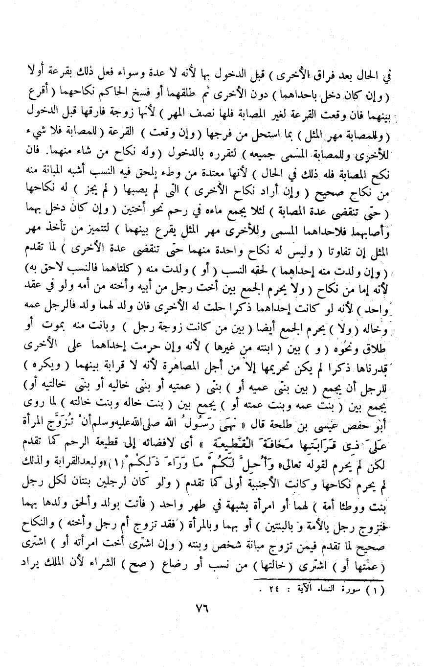 (وَيُكْرَهُ) لِلرَّجُلِ أَنْ يَجْمَع (بَيْنَ بِنْتَيْ عَمَّيْهِ أَوْ) بِنْتَيْ (عَمَّتَيْهِ أَوْ بِنْتَيْ خَالَيْهِ أَوْ بِنْتَيْ خَالَتَيْهِ أَوْ) يَجْمَعُ بَيْنَ (بِنْتِ عَمِّهِ وَبِنْتِ عَمَّتِهِ أَوْ) يَجْمَعُ بَيْنَ (بِنْتِ خَالِهِ وَبِنْتِ خَالَتِهِ) لِمَا رَوَى أَبُو حَفْصٍ عِيسَى بْنُ طَلْحَةَ قَالَ «نَهَى رَسُولُ اللَّهِ - صَلَّى اللَّهُ عَلَيْهِ وَسَلَّمَ - أَنْ تُزَوَّجَ الْمَرْأَةُ عَلَى ذِي قَرَابَتِهَا مَخَافَةَ الْقَطِيعَةِ» أَيْ لِإِفْضَائِهِ إلَى قَطِيعَةِ الرَّحِمِ كَمَا تَقَدَّمَ لَكِنْ لَمْ يَحْرُمْ لِقَوْلِهِ تَعَالَى {وَأُحِلَّ لَكُمْ مَا وَرَاءَ ذَلِكُمْ} [النساء: ٢٤] وَلِبُعْدِ الْقَرَابَةِ وَلِذَلِكَ لَمْ يَحْرُمْ نِكَاحُهَا وَكَانَتْ الْأَجْنَبِيَّةُ أَوْلَى كَمَا تَقَدَّمَ (وَلَوْ كَانَ لِرَجُلَيْنِ بِنْتَانِ لِكُلِّ رَجُلٍ بِنْتٌ وَوَطِئَا أَمَةً) لَهُمَا أَوْ امْرَأَةً بِشُبْهَةٍ فِي طُهْرٍ وَاحِدٍ (فَأَتَتْ بِوَلَدٍ وَأُلْحِقَ وَلَدُهَا بِهِمَا فَتَزَوَّجَ رَجُلٌ بِالْأَمَةِ وبِالْبِنْتَيْنِ) أَوْ بِهِمَا وَبِالْمَرْأَةِ (فَقَدْ تَزَوَّجَ أُمّ رَجُلٍ وَأُخْتَهُ) وَالنِّكَاحُ صَحِيحٌ لِمَا تَقَدَّمَ فِيمَنْ تَزَوَّجَ مُبَانَة شَخْصٍ وَبِنْتَهُ.