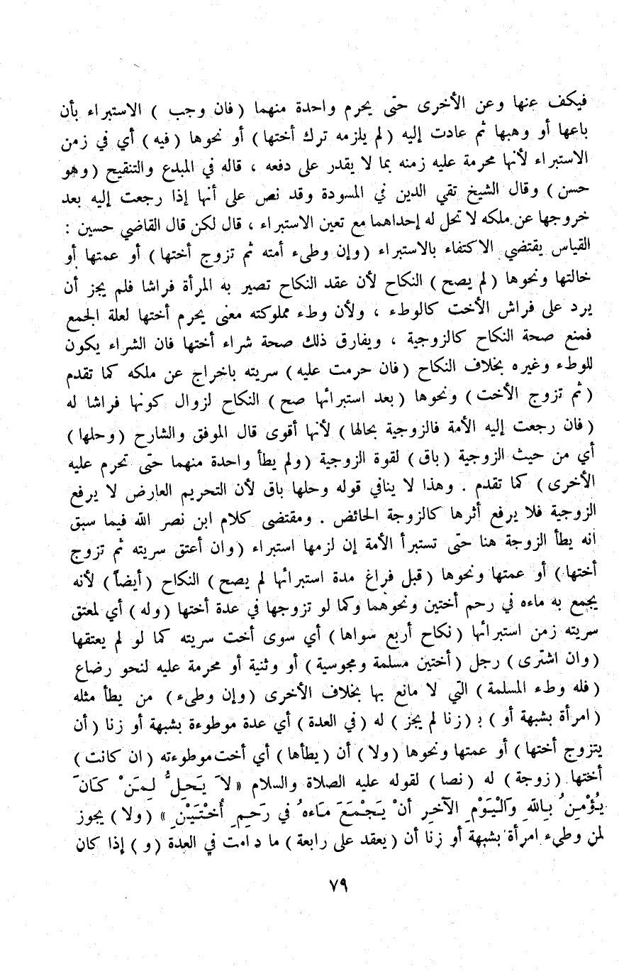 (وَإِنْ اشْتَرَى) رَجُلٌ (أُخْتَيْنِ مُسْلِمَةً وَمَجُوسِيَّةً) أَوْ وَثَنِيَّةً أَوْ مُحَرَّمَةً عَلَيْهِ لِنَحْوِ رَضَاعٍ (فَلَهُ وَطْءُ الْمُسْلِمَةِ) الَّتِي لَا مَانِعَ بِهَا بِخِلَافِ الْأُخْرَى (وَإِنْ وَطِئَ) مَنْ يَطَأُ مِثْلُهُ (امْرَأَةً بِشُبْهَةٍ أَوْ) بِزِنًا (لَمْ يَجُزْ) لَهُ (فِي الْعِدَّةِ) أَيْ عِدَّةِ مَوْطُوءَةٍ بِشُبْهَةٍ أَوْ زِنًا (أَنْ يَتَزَوَّجَ أُخْتَهَا) أَوْ عَمَّتَهَا وَنَحْوَهَا.