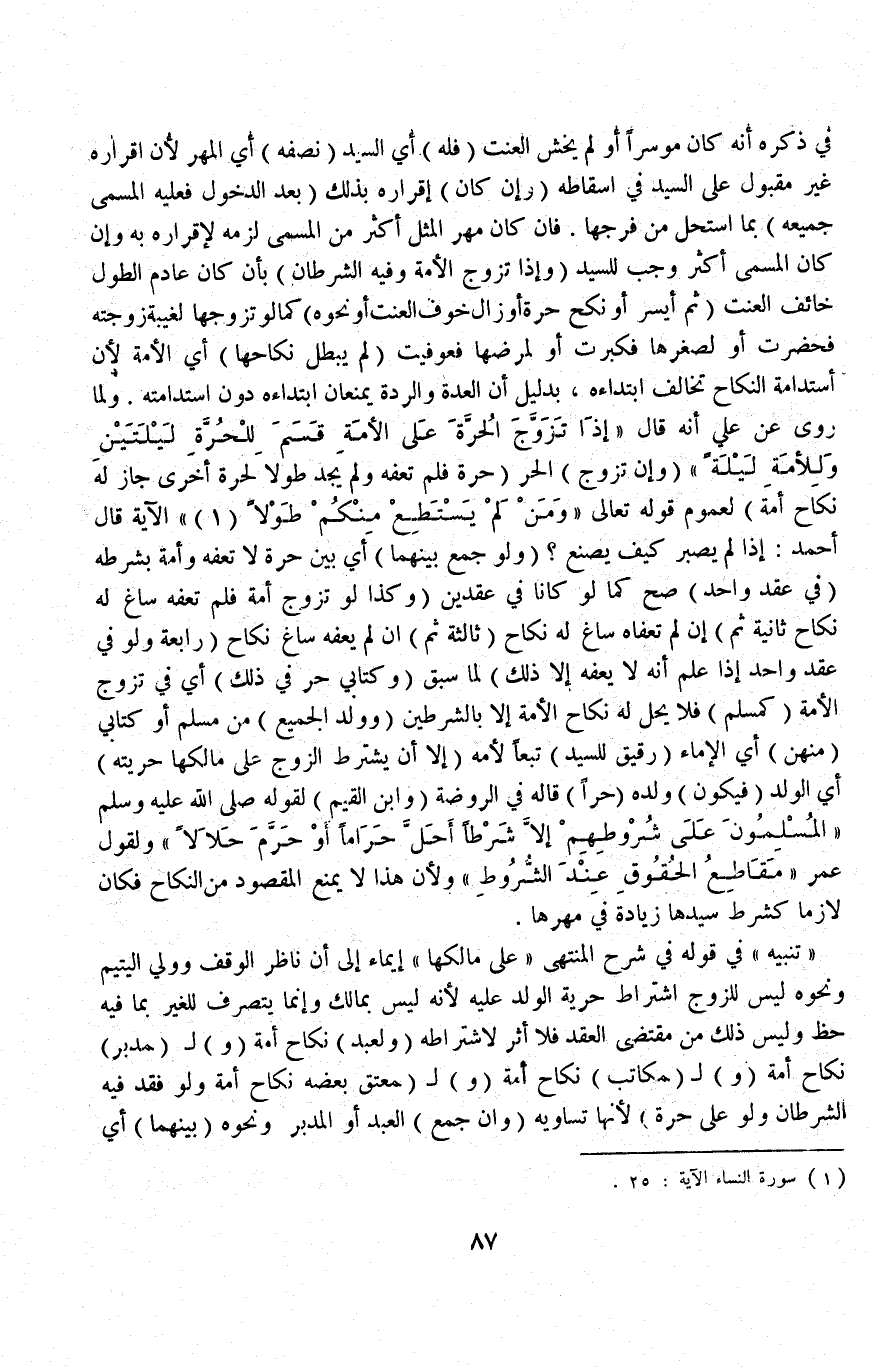 وَإِنَّمَا يَتَصَرَّفُ لِلْغَيْرِ بِمَا فِيهِ حَظٌّ وَلَيْسَ ذَلِكَ مِنْ مُقْتَضَى الْعَقْدِ فَلَا أَثَرَ لِاشْتِرَاطِهِ (وَلِعَبْدٍ) نِكَاحُ أَمَةٍ (وَ) لِ (مُدَبَّرٍ) نِكَاحُ أَمَةٍ (وَ) لِ (مُكَاتَبٍ) نِكَاحُ أَمَةٍ (وَ) لِ (مُعْتَقٍ بَعْضُهُ نِكَاحُ أَمَةٍ وَلَوْ فُقِدَ فِيهِ الشَّرْطَانِ وَلَوْ عَلَى حُرَّةٍ) لِأَنَّهَا تُسَاوِيهِ.