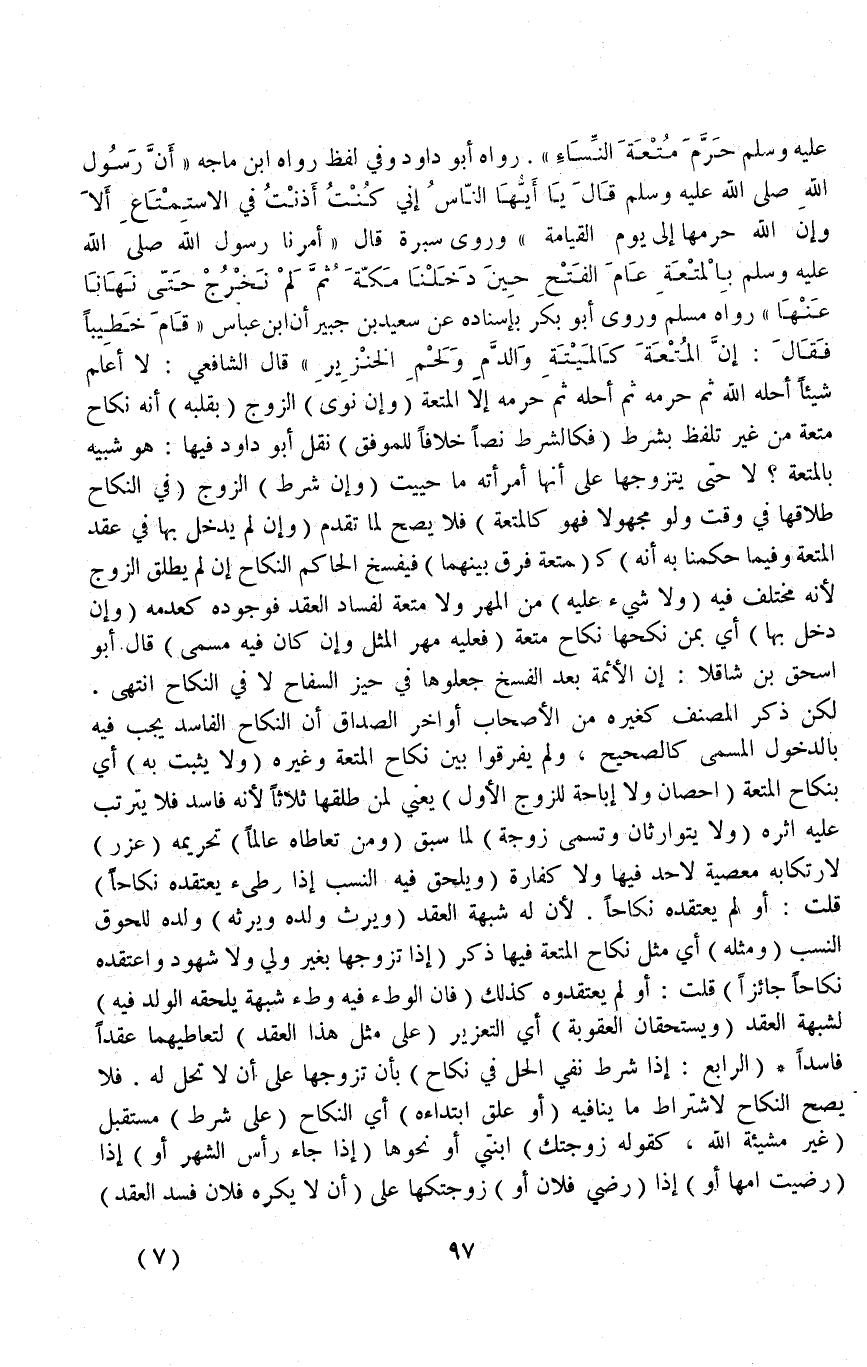 وَرَوَى أَبُو بَكْرٍ بِإِسْنَادِهِ عَنْ سَعِيدِ بْنِ جُبَيْرٍ أَنَّ ابْنَ عَبَّاسٍ " قَامَ خَطِيبًا فَقَالَ: إنَّ الْمُتْعَةَ كَالْمَيْتَةِ وَالدَّمِ وَلَحْمِ الْخِنْزِيرِ قَالَ الشَّافِعِيُّ لَا أَعْلَمُ شَيْئًا أَحَلَّهُ اللَّهُ ثُمَّ حَرَّمَهُ ثُمَّ أَحَلَّهُ ثُمَّ حَرَّمَهُ إلَّا الْمُتْعَةَ (وَإِنْ نَوَى) الزَّوْجُ (بِقَلْبِهِ) أَنَّهُ نِكَاحُ مُتْعَةٍ مِنْ غَيْرِ تَلَفُّظٍ بِشَرْطٍ (فَكَالشَّرْطِ نَصًّا خِلَافًا لِلْمُوَفَّقِ) نَقَلَ أَبُو دَاوُد فِيهَا: هُوَ شَبِيهٌ بِالْمُتْعَةِ؟ لَا حَتَّى يَتَزَوَّجَهَا عَلَى أَنَّهَا امْرَأَتُهُ مَا حَيِيتُ.