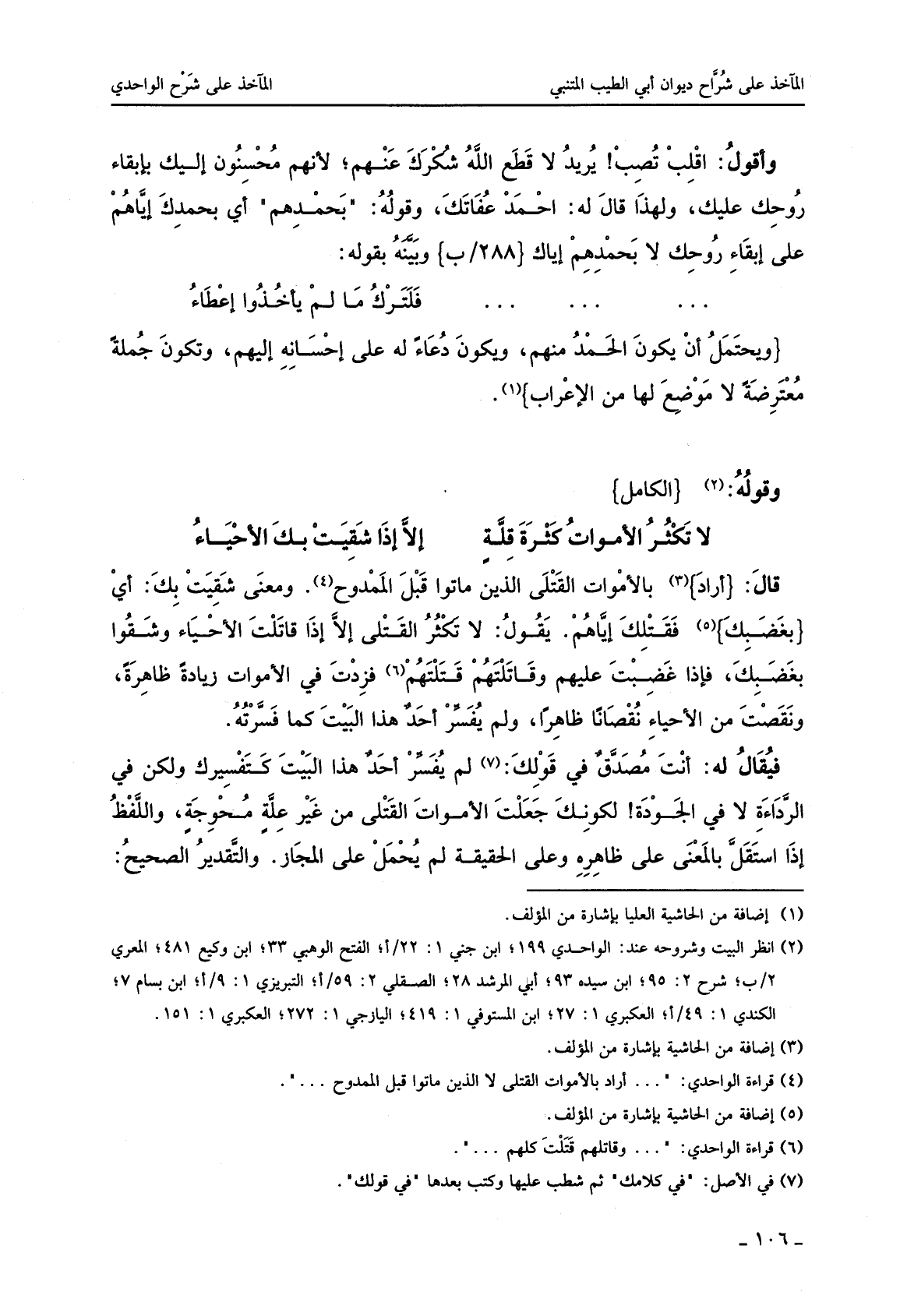 قال: أراد بالأموات القتلى الذين ماتوا قبل الممدوح ومعنى شقيت بك: أي بغضبك فقتلك إياهم. يقول: لا تكثر القتلى إلا إذا قاتلت الأحياء وشقوا بغضبك، فإذا غضبت عليهم وقاتلتهم قتلتهم فزدت في الأموات زيادة ظاهرة، ونقصت من الأحياء نقصانا ظاهرا، ولم يفسر أحد هذا البيت كما فسرته.
