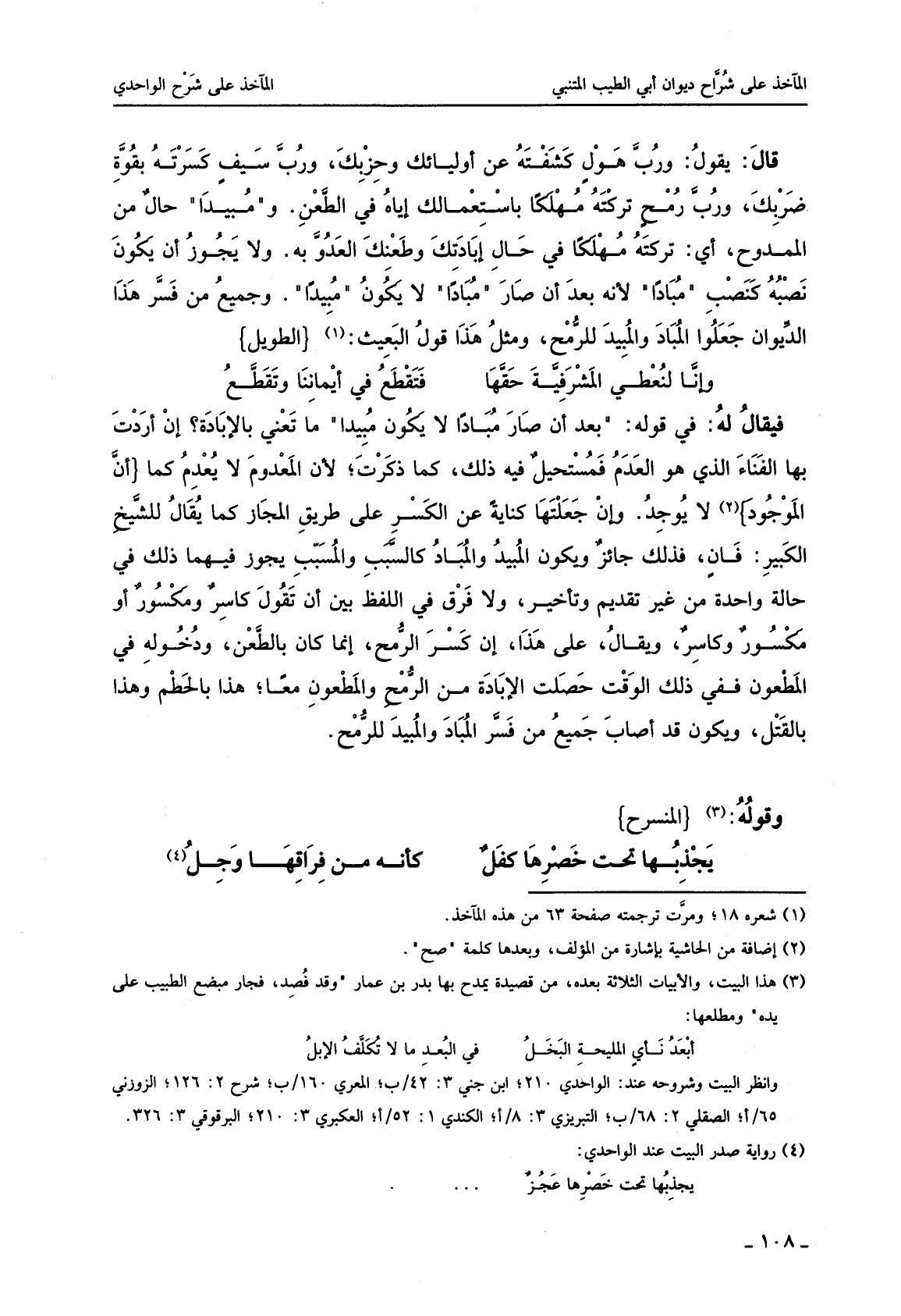 قال: يقول: ورب هول كشفته عن أوليائك وحزبك، ورب سيف كسرته بقوة ضربك، ورب رمح تركته مهلكا باستعمالك إياه في الطعن. ومبيدا حال من الممدوح، أي: تركته مهلكا في حال إبادتك وطعنك العدو به. ولا يجوز أن يكون نصبه كنصب مبادا لأنه بعد أن صار مبادا لا يكون مبيدا. وجميع من فسر هذا الديوان جعلوا المباد والمبيد للرمح، ومثل هذا قول البعيث: الطويل
