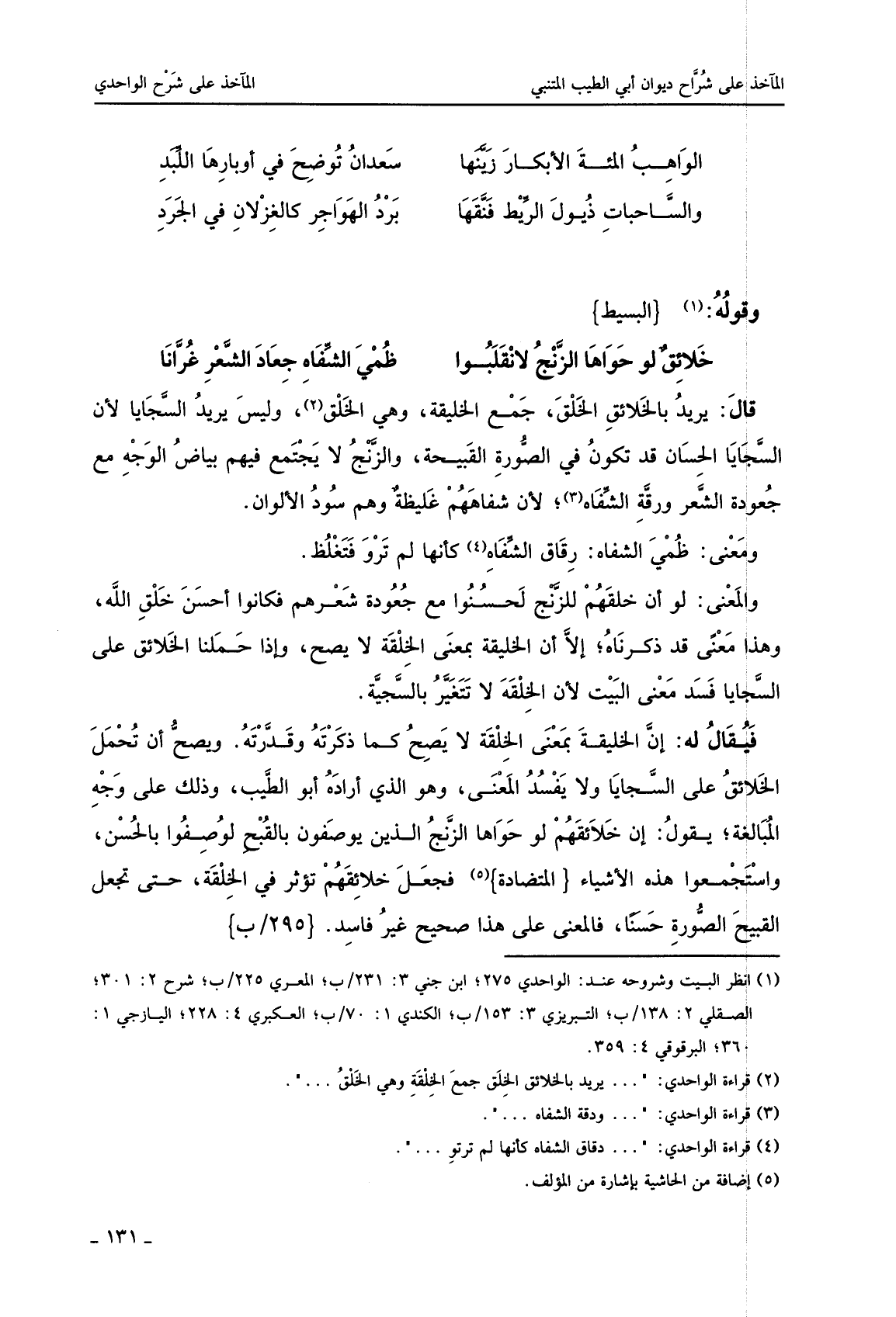 فيقال له: أن الخليقة بمعنى الخلقة لا يصح كما ذكرته وقدرته. ويصح أن تُحمل الخلائق على السجايا ولا يفسد المعنى، وهو الذي أراده أبو الطيب، وذلك على وجه المبالغة؛ يقول: إن خلائقهم لو حواها الزنج الذين يوصفون بالقبح لوصفوا بالحسن، واستجمعوا هذه الأشياء المتضادة فجعل خلائقهم تؤثر في الخلقة، حتى تجعل القبيح الصورة حسنا، فالمعنى على هذا صحيح غير فاسد.