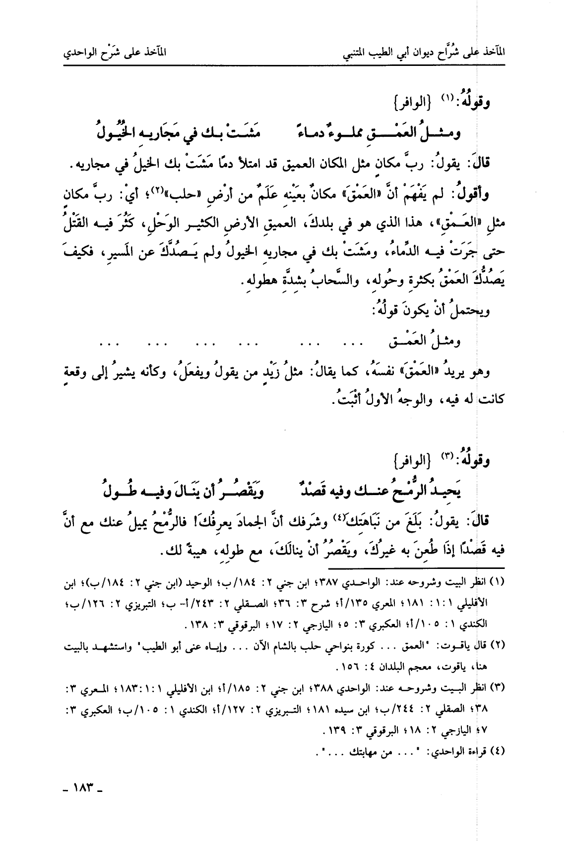 وأقول: لم يفهم أن (العمق) مكان بعينه علم من أرض (حلب)؛ أي: رب مكان مثل (العمق)، هذا الذي هو في بلدك، العميق الأرض الكثير الوحل، كثر فيه القتل حتى جرت فيه الدماء، ومشت بك في مجاريه الخيول ولم يصدك عن المسير، فكيف يصدك العمق بكثرة وحوله، والسحاب بشدة هطوله.