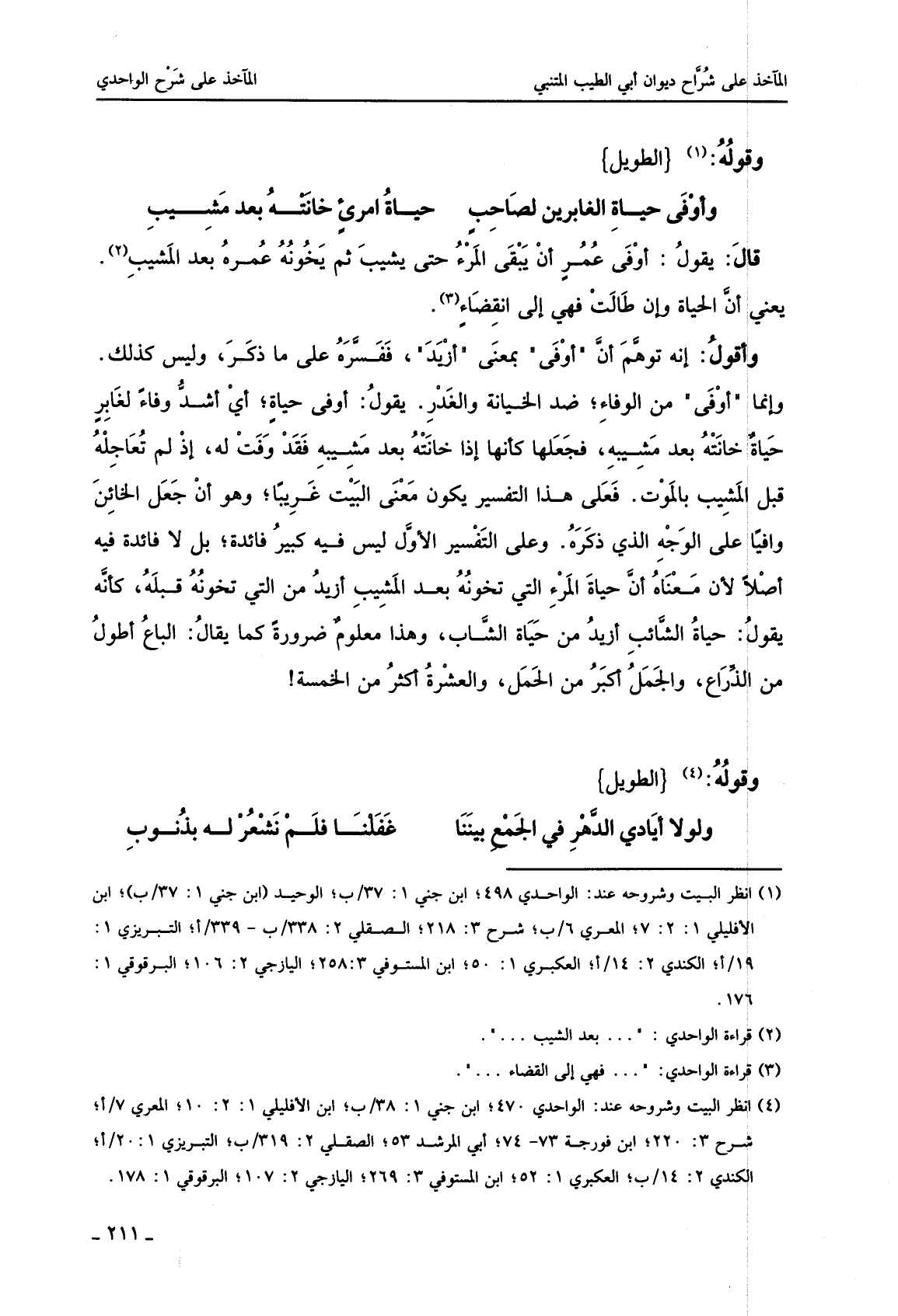 وأقول: إنه توهم أن أوفى بمعنى أزيد، ففسره على ما ذكر، وليس كذلك. وإنما أوفى من الوفاء؛ ضد الخيانة والغدر. يقول: أوفى حياة؛ أي أشد وفاء لغابر حياة خانته بعد مشيبه، فجعلها كأنها إذا خانته بعد مشيبه فقد وفت له، إذ لم تعاجله قبل المشيب بالموت. فعلى هذا التفسير يكون معنى البيت غريبا؛ وهو أن جعل الخائن وافيا على الوجه الذي ذكره. وعلى التفسير الأول ليس فيه كبير فائدة؛ بل لا فائدة فيه أصلا لأن معناه أن حياة المرء التي تخونه بعد المشيب أزيد من التي تخونه