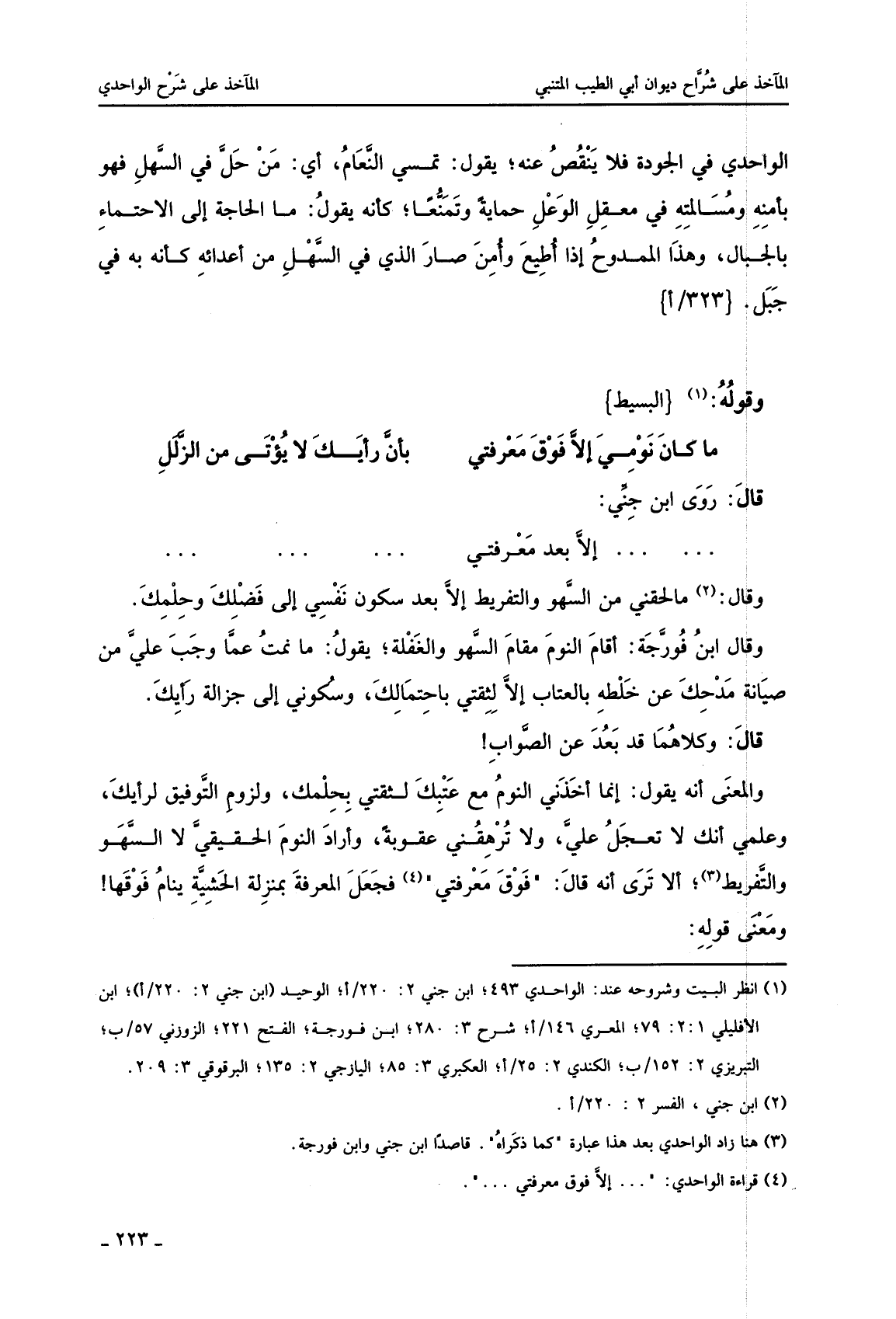 الواحدي في الجودة فلا ينقص عنه؛ يقول: تمسي النعام، أي: من حلّ في السهل فهو بأمنه ومسالمته في معقل الوعل حماية وتمنعا؛ كأنه يقول: ما الحاجة إلى الاحتماء بالجبال، وهذا الممدوح إذا أطيع وأمن صار الذي في السهل من أعدائه كأنه به في جبل