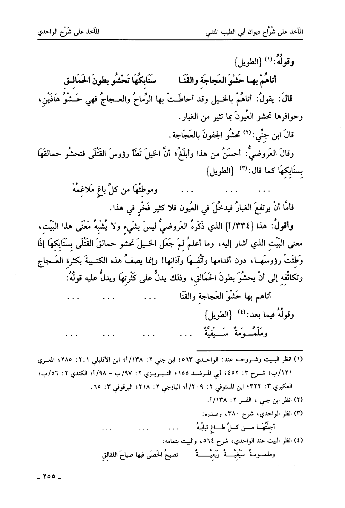 وأقول: هذا الذي ذكره العروضي ليس بشيء ولا يشبه معنى هذا البيت، معنى البيت الذي أشار اليه، وما أعلم لم جعل الخيل تحشو حمالق القتلى بسنابكها إذا وطئت رؤوسها، دون أقدامها وآنفها وآذانها! وإنما يصف هذه الكتيبة بكثرة العجاج وتكاثفه إلى أن يحشو بطون الحمالق، وذلك يدل على كثرتها ويدل عليه قوله: