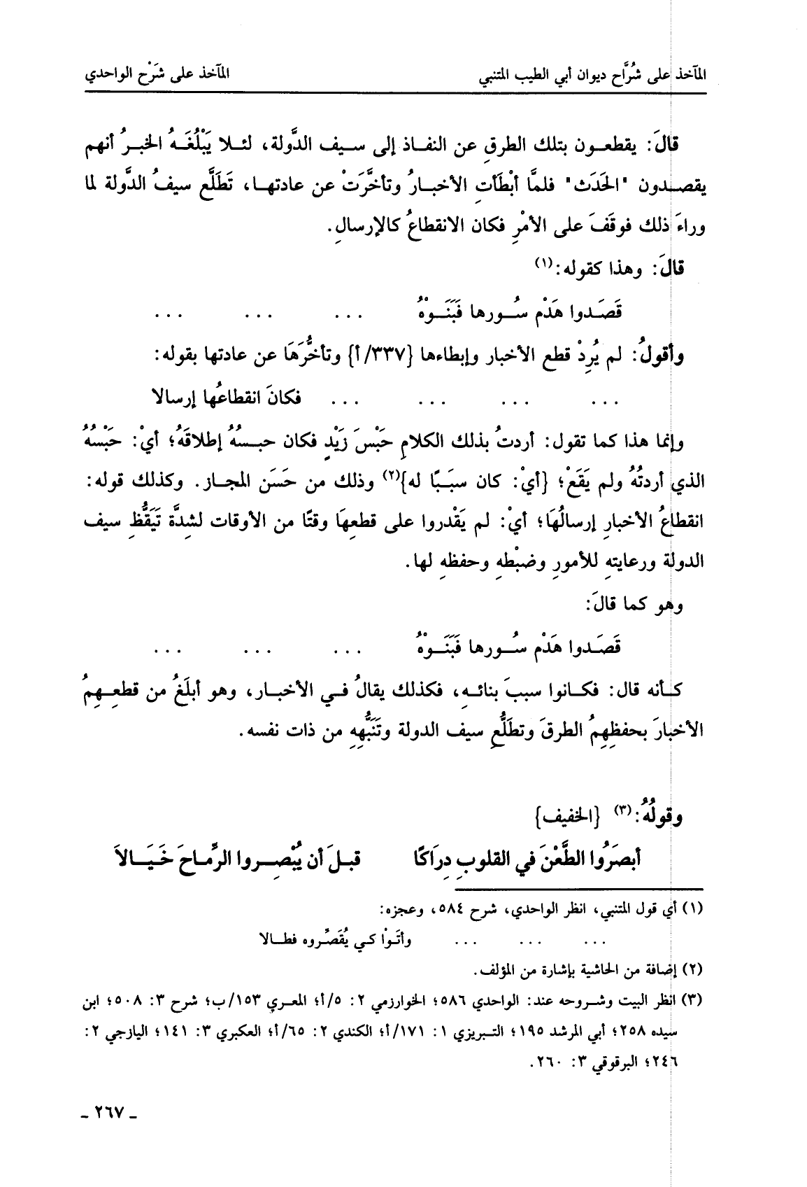 قال: يقطعون بتلك الطرق عن النفاذ إلى سيف الدولة، لئلا يبلغه الخبر أنهم يقصدون الحدث فلما أبطأت الأخبار وتأخرت عن عادتها، تطلَّع سيف الدولة لما وراء ذلك فوقف على الأمر فكان الانقطاع كالإرسال.