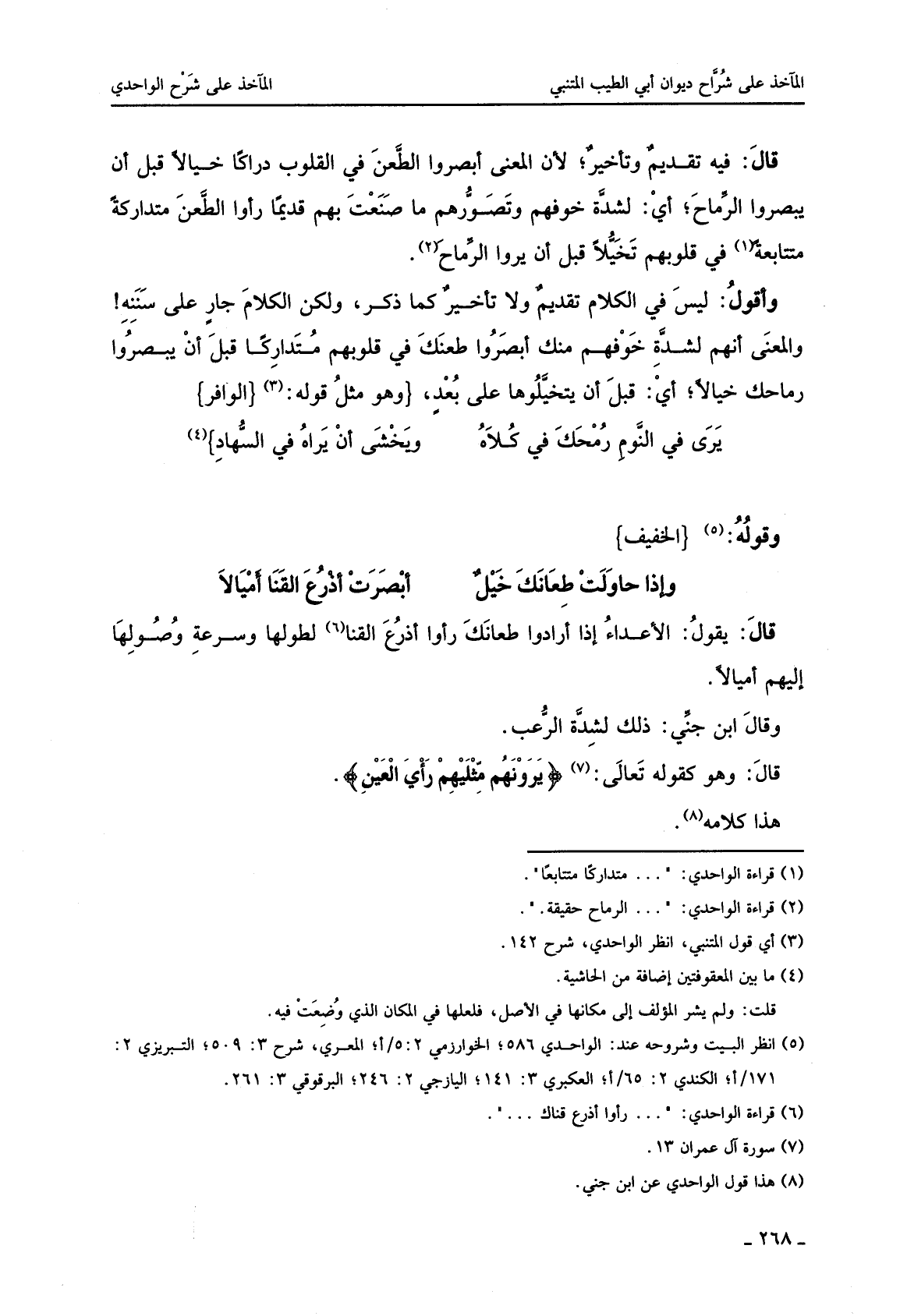 وأقول: ليس في الكلام تقديم ولا تأخير كما ذكر، ولكن الكلام جار على سننه! والمعنى أنهم لشدة خوفهم منك أبصروا طعنك في قلوبهم متدراكا قبل أن يبصروا رماحك خيالا؛ أي: قبل أن يتخيلوها على بعد، وهو مثل قوله: الوافر