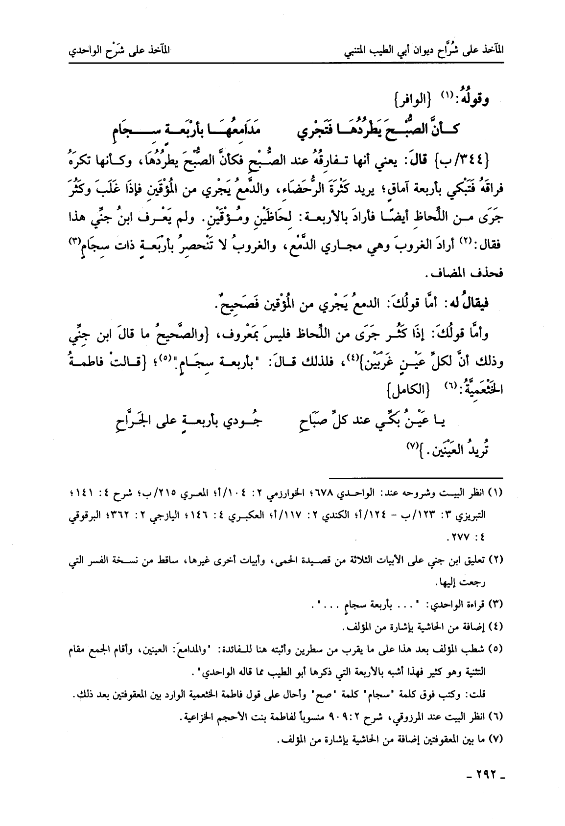 قال: يعني إنها تفارقه عند الصبح فكأن الصبح يطؤدها، وكأنها تكره فراقه فتبكي بأربعة آماق؛ يريد كثرة الرخصاء، والدمع يجري من المؤقين فإذا غلب وكثر جرى من اللحاظ أيضا فأراد بالأربعة: لحاضين ومؤقين. ولك يعرف ابن جني هذا فقال: أراد الغروب وهي مجاري الدمع، والغروب لا تنحصر بأربعة ذات سجام فحذف المضاف.