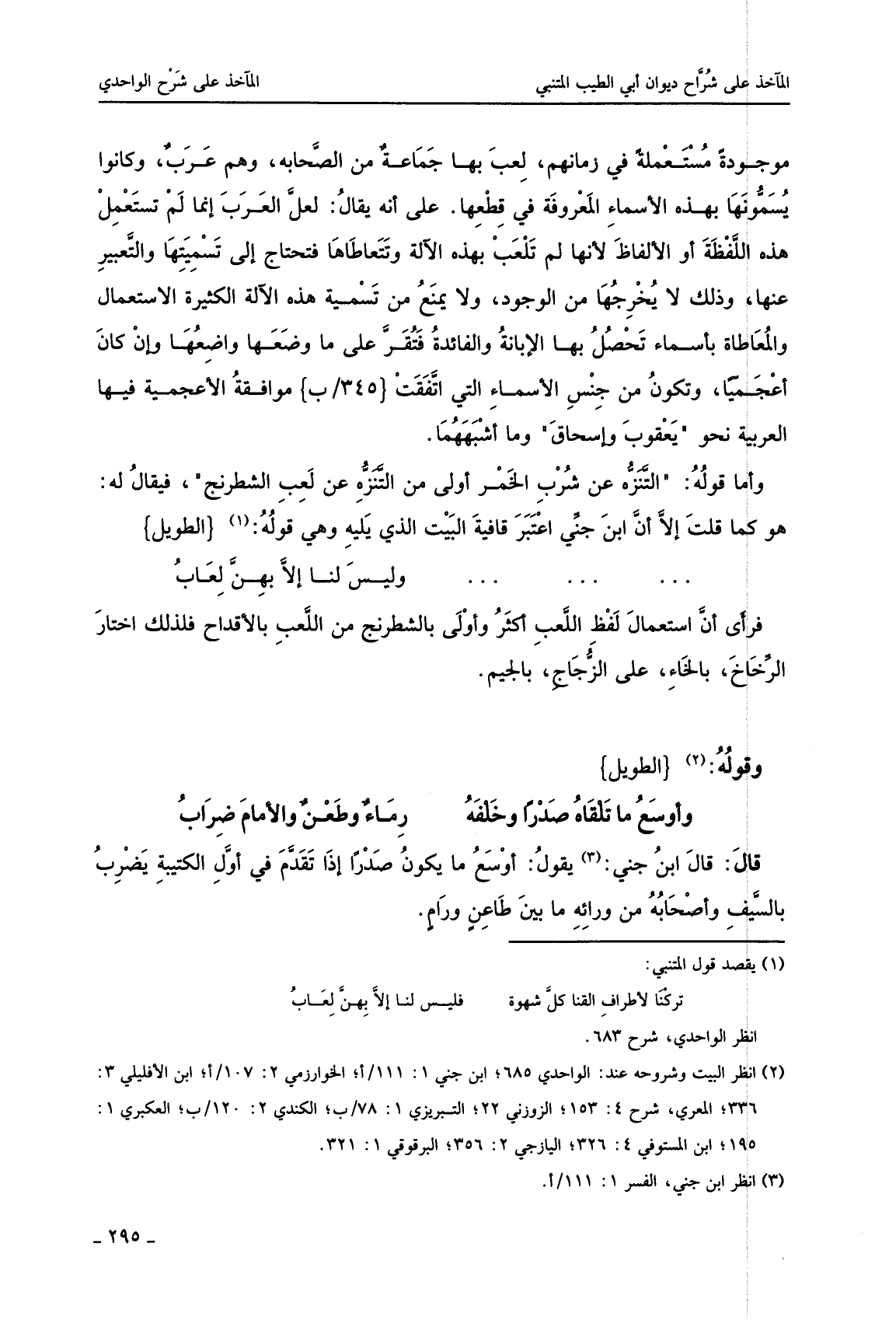 وأما قوله: التنزه عن شرب الخمر أولى من التنزه عن لعب الشطرنج، فيقال له: هو كما قلت إلا أن ابن جني اعتبر قافية البيت الذي يليه وهو قوله: الطويل