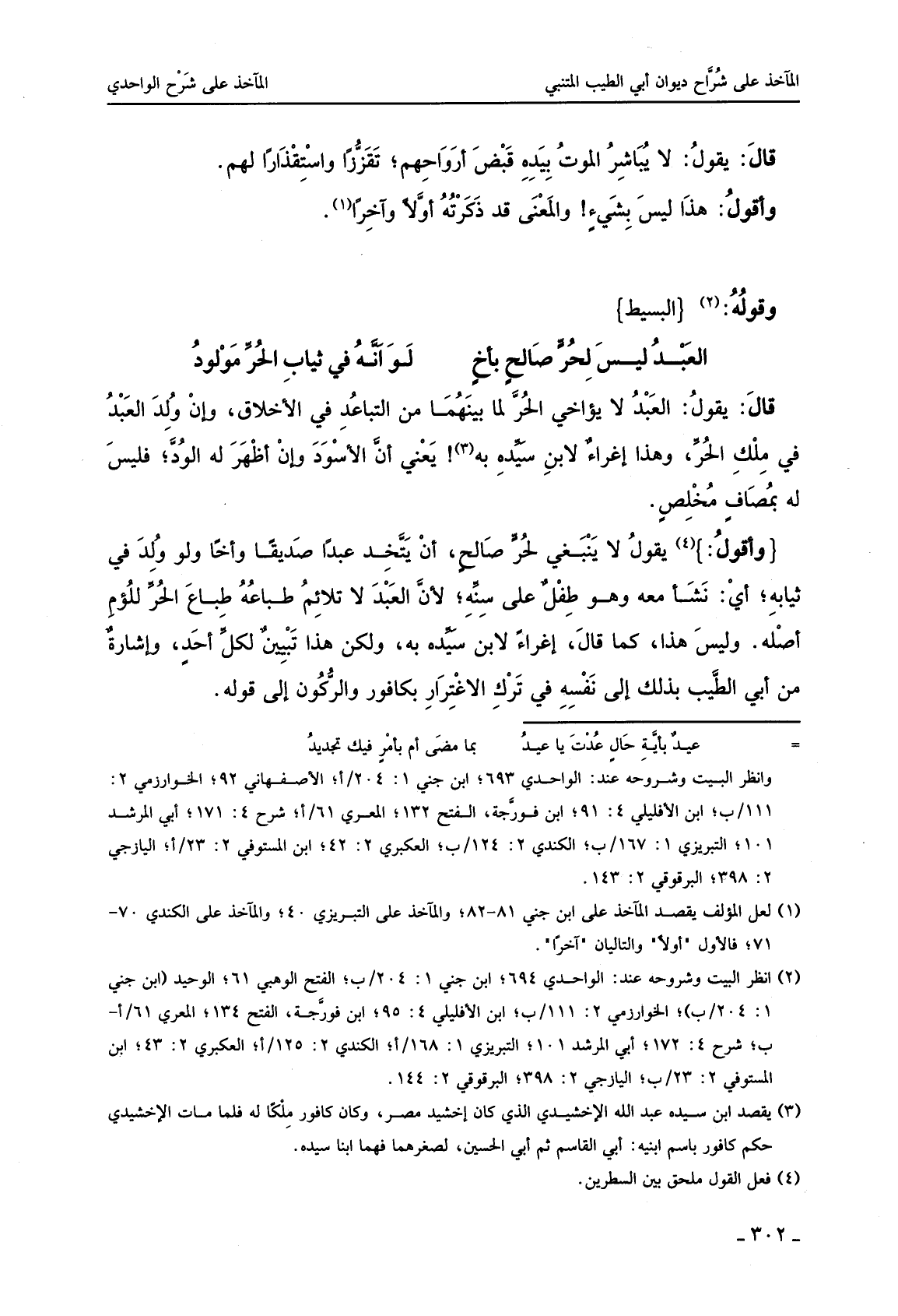 وأقول: يقول لا ينبغي لحر صالح، أن يتخذ عبدا صديقا وأخا ولو ولد في ثيابه؛ أي: نشأ معه وهو طفل على سنه؛ لأن العبد لا تلائم طباعه طباع الحر للؤم أصله. وليس هذا، كما قال، إغراء لابن سيده به، ولكن هذا تبيين لكل أحد، وإشارة من أبي الطيب بذلك إلى نفسه في ترك الاغترار بكافور والركون إلى قوله.