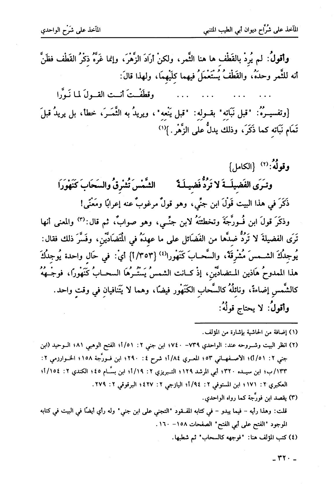 وذكر قول ابن فورجة وتخطئته لابن جني، وهو صواب، ثم قال: والمعنى أنها ترى الفضيلة لا ترد ضدها من الفضائل على ما عهده في المتضادين، وفسر ذلك فقال: يوجدك الشمس مشرقة، والسحاب كنهورا أي: في حال واحدة يُوجدك هذا الممدوح هاذين المتضادين، إذ كانت الشمس يسترها السحاب كنهورا، فوجهه كالشمس إضاءة، ونائله كالسحاب الكنهور فيضا، وهما لا يتنافيان في وقت واحد.