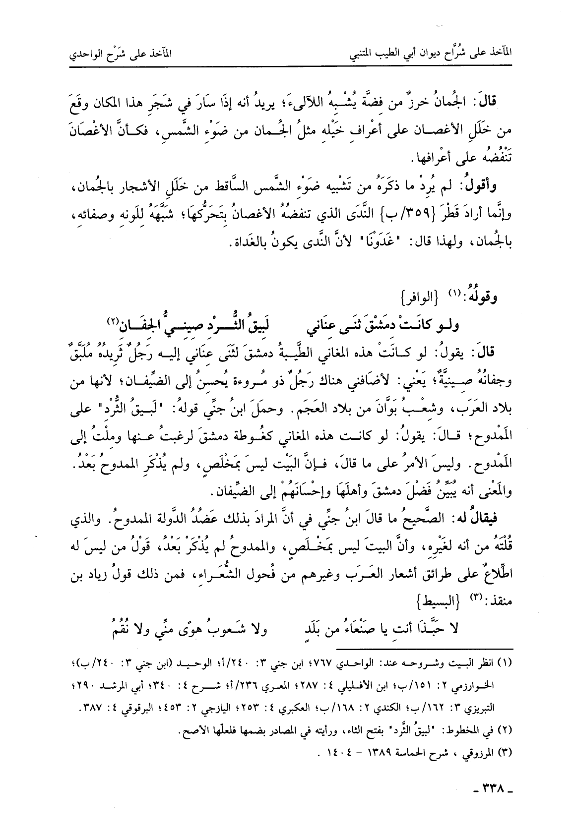 فيقال له: الصحيح ما قال ابن جني في أن المراد بذلك عضد الدولة الممدوح. والذي قلته من إنه لغيره، وان البيت ليس بمخلص، والممدوح لم يذكر بعد، قول من ليس له اطلاع على طرائق أشعار العرب وغيرهم من فحول الشعراء، فمن ذلك قول زياد بن منقذ: البسيط