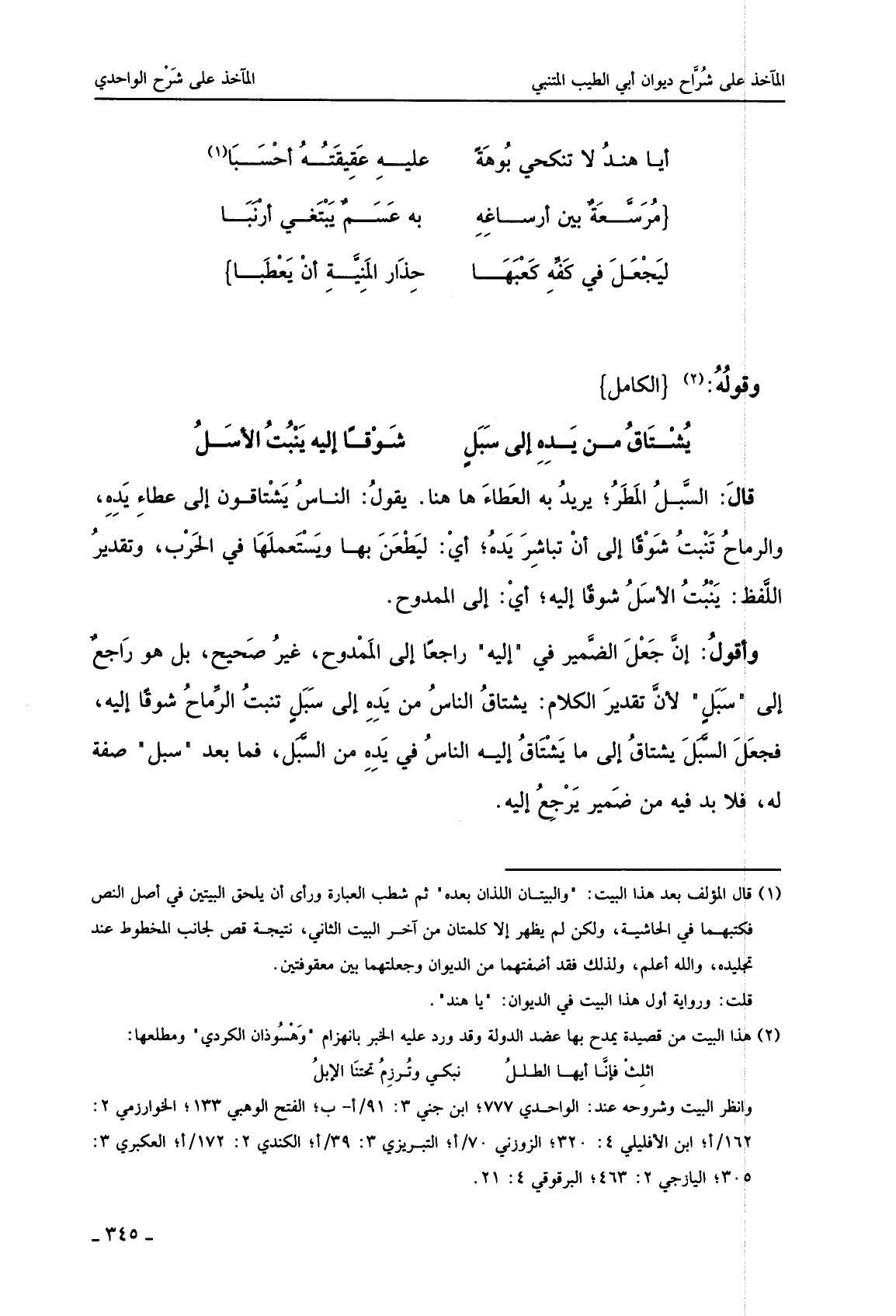 وأقول: إن جعل الضمير في إليه راجعا إلى الممدوح، غير صحيح، بل هو راجع إلى سبل لأن تقدير الكلام: يشتاق الناس من يده إلى سبل تنبت الرماح شوقا إليه، فجعل السبل يشتاق إلى ما يشتاق إليه الناس في يده من السبل، فما بعد سبل صفة له، فلا بد فيه من ضمير يرجع إليه.