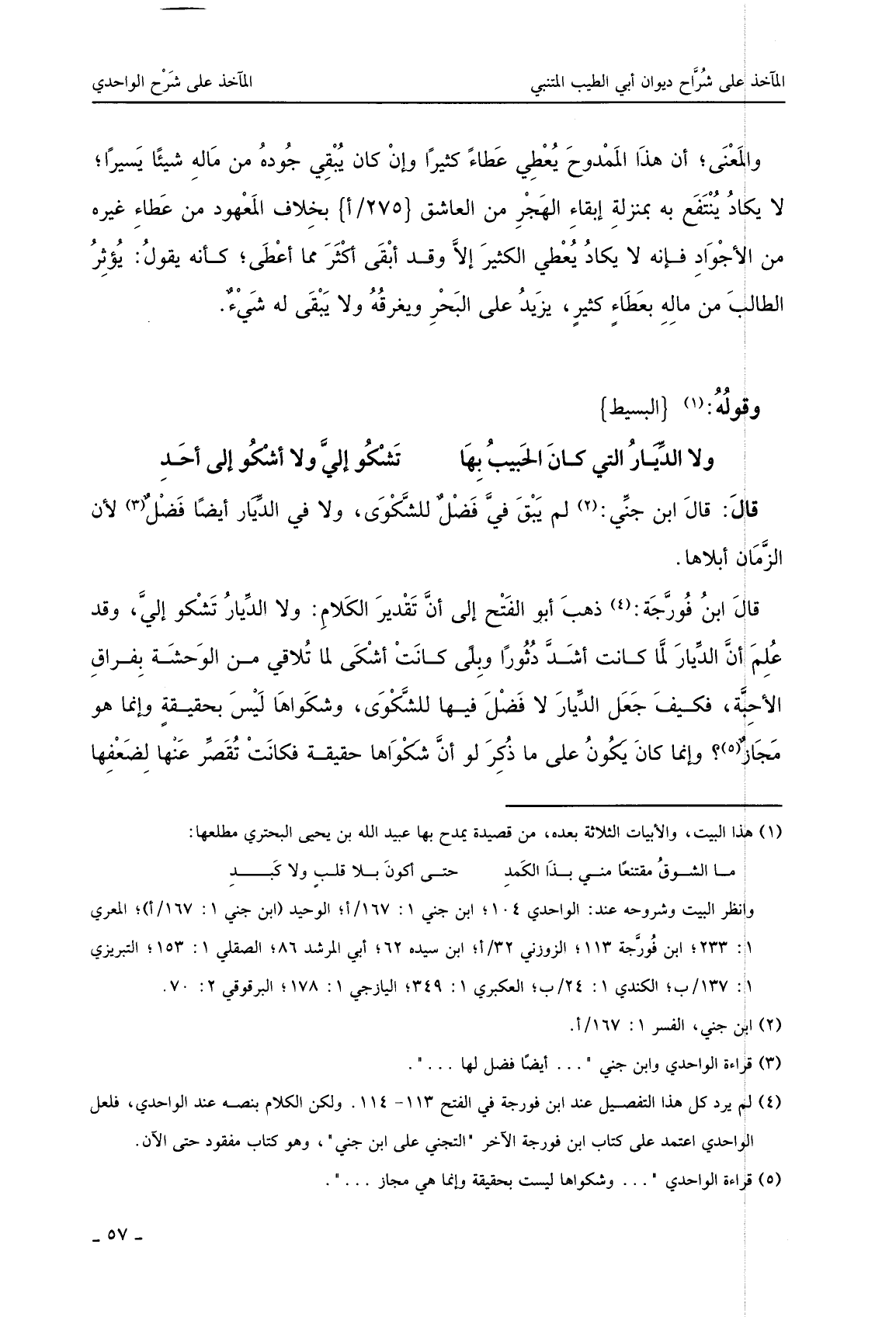 قال ابن فورجة: ذهب أبو الفتح إلى إن تقدير الكلام: ولا الديار تشكو إلي، وقد عُلم أن الديار لما كانت أشد دثوراً وبلىً كانت أشكى لما تُلاقي من الوحشة بفراق الأحبة، فكيف جعل الديار لا فضل فيها للشكوى، وشكواها ليس بحقيقة وإنما هو مجاز؟ وإنما كان يكون على ما ذُكر لو أن شكواها حقيقة فكانت تُقصّر عنها لضعفها