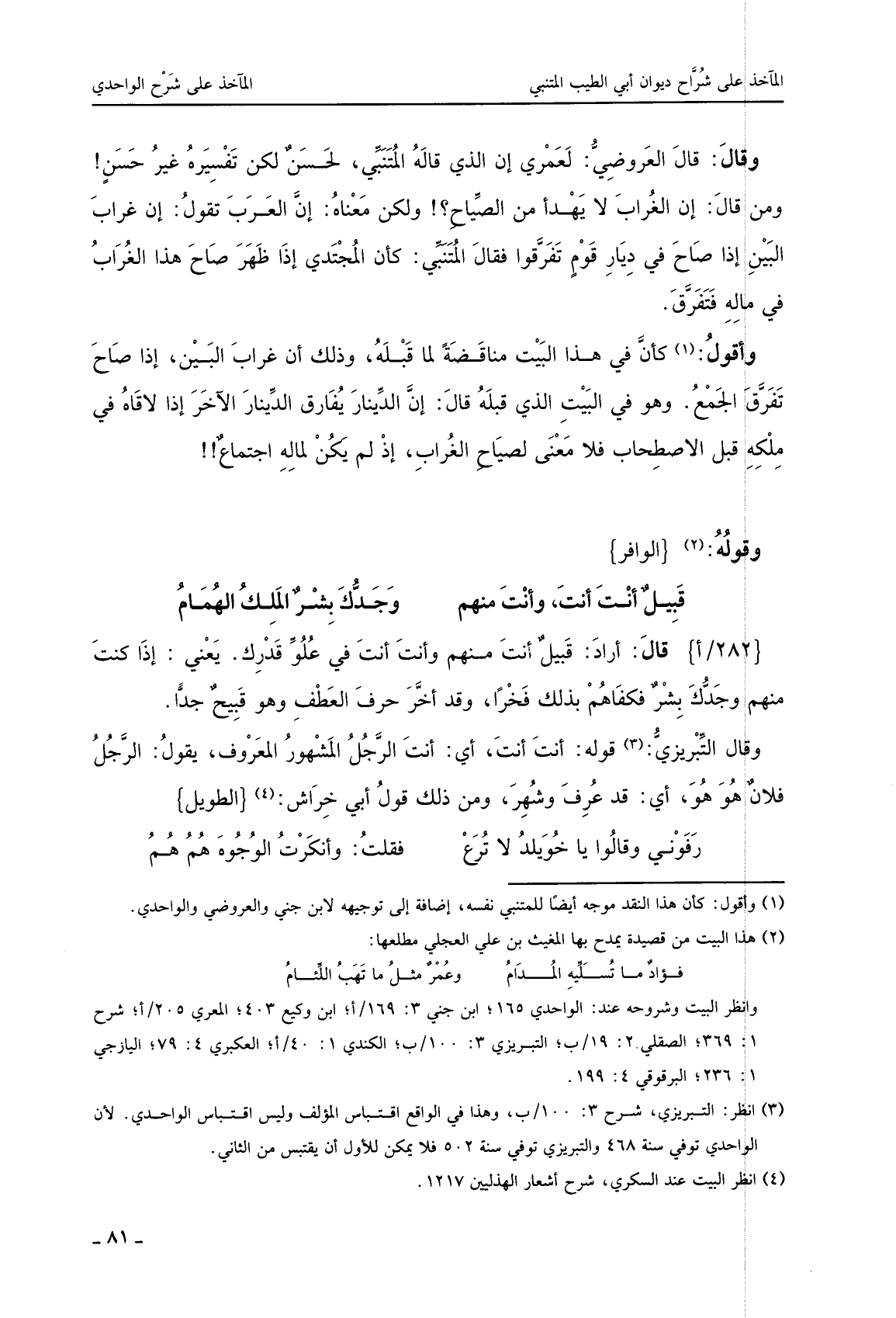 وقال: قال العروضي: لعمري إن الذي قاله المتنبي، لحسن لكن تفسيره غير حسن! ومن قال: إن الغراب لا يهدأ من الصياح؟! ولكن معناه: إن العرب تقول: إن غراب البين إذا صاح في ديار قوم تفرقوا فقال المتنبي: كأن المجتدي إذا ظهر صاح هذا الغراب في ماله فتفرق