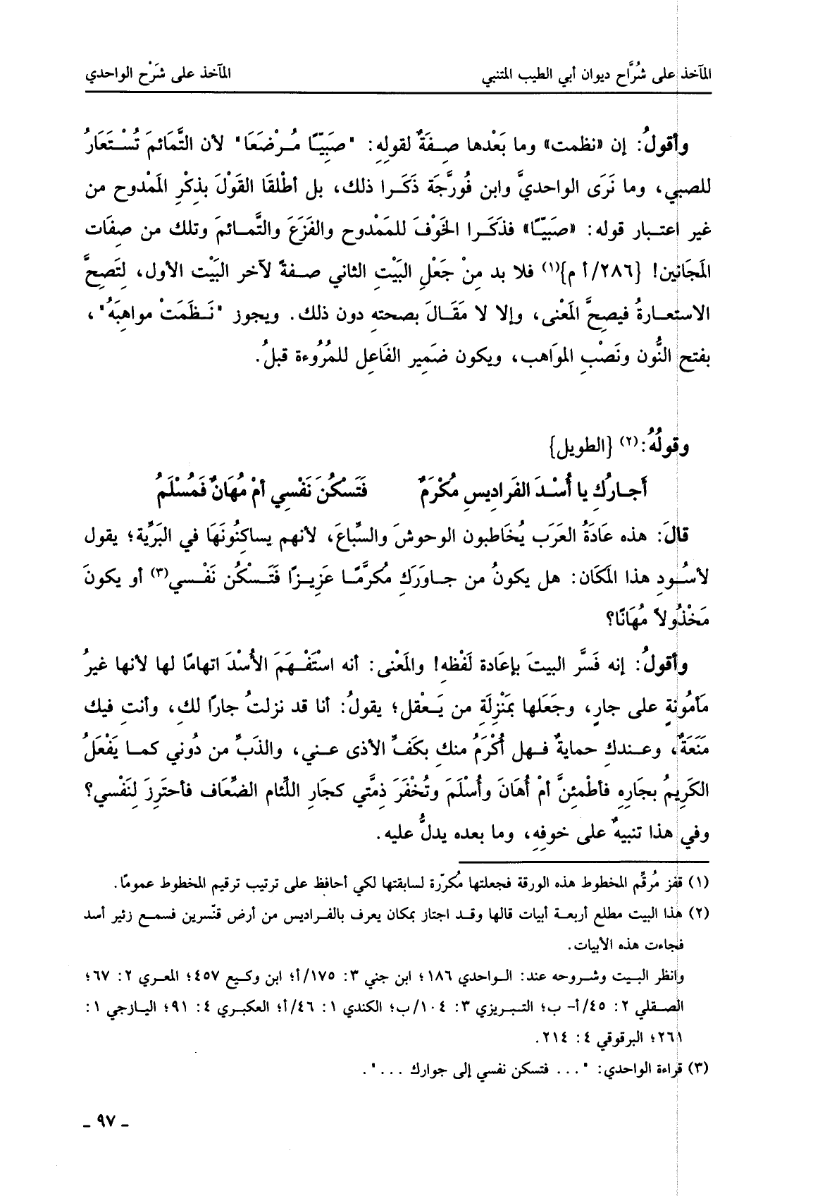 وأقول: إن (نظمت) وما بعدها صفة لقوله: صبيا مرضعا لأن التمائم تُستعار للصبي، وما نرى الواحدي وابن فورجة ذكرا ذلك، بل أطلقا القول بذكر الممدوح من غير اعتبار قوله: (صبيا) فذكرا الخوف للممدوح والفزع والتمائم وتلك من صفات المجانين! م فلا بد من جعل البيت الثاني صفة لآخر البيت الاول، لتصح الاستعارة فيصح المعنى، وإلا لا مقال بصحته دون ذلك. ويجوز نظمت مواهبه، بفتح النون ونصب المواهب، ويكون ضمير الفاعل للمروءة قبل.