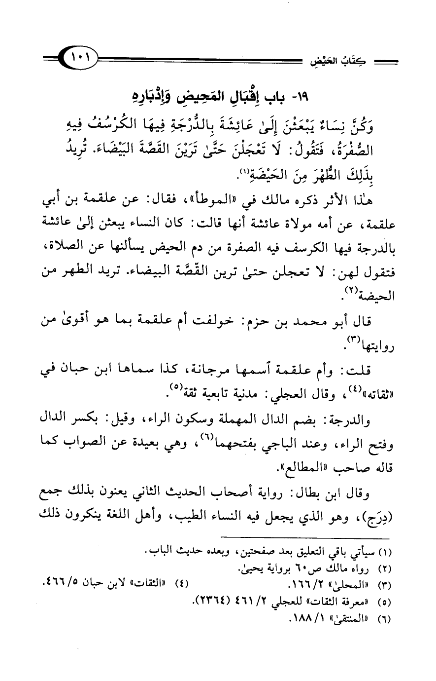 هذا الأثر ذكره مالك في "الموطأ"، فقال: عن علقمة بن أبي علقمة، عن أمه مولاة عائشة أنها قالت: كان النساء يبعثن إلى عائشة بالدرجة فيها الكرسف فيه الصفرة من دم الحيض يسألنها عن الصلاة، فتقول لهن: لا تعجلن حتى ترين القّصَّة البيضاء. تريد الطهر من الحيضة (¬2).