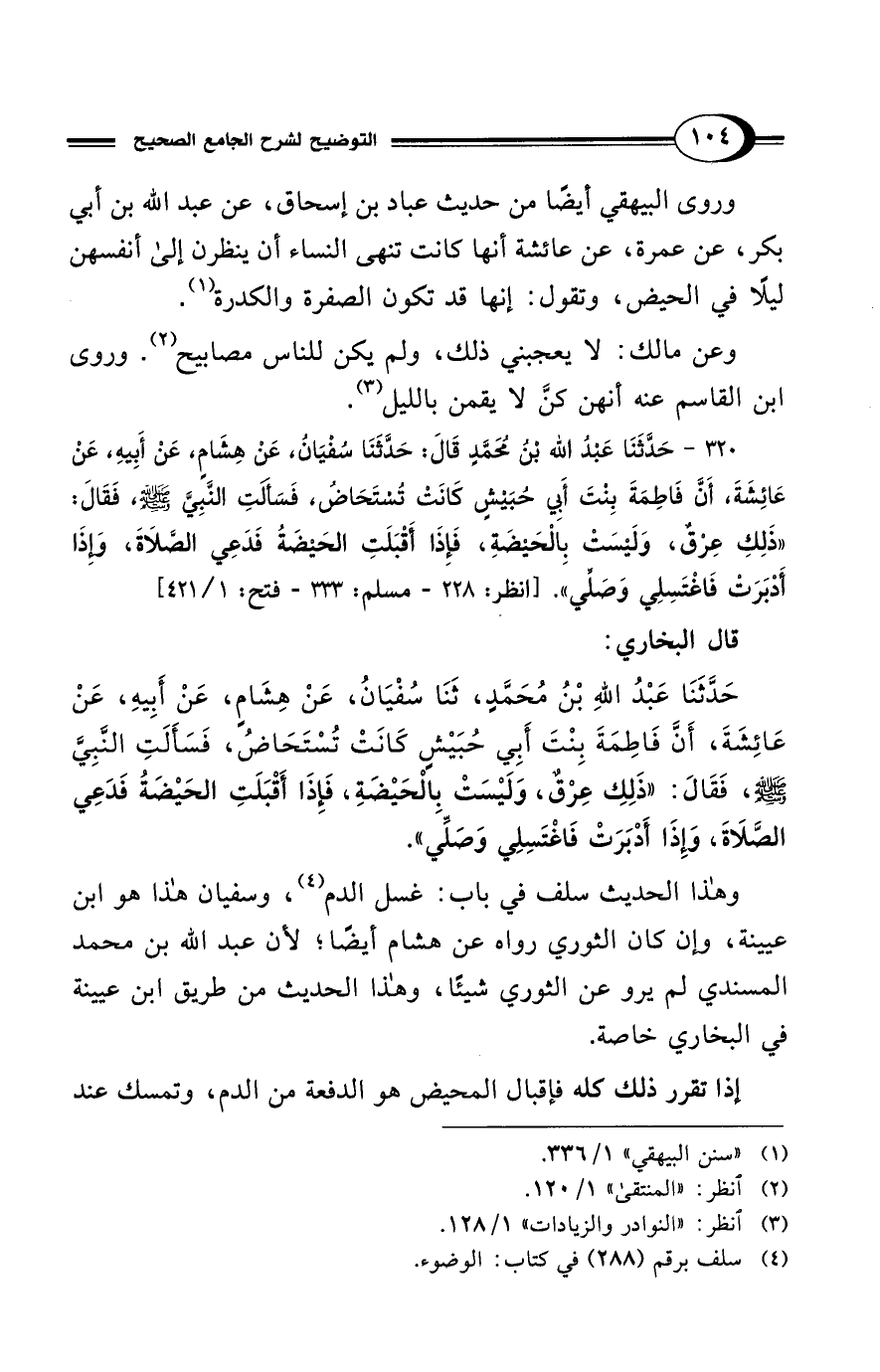 320 - حَدَّثَنَا عَبْدُ الله بْنُ مُحَمَّدٍ قَالَ: حَدَّثَنَا سُفْيَانُ، عَنْ هِشَامِ، عَنْ أَبِيهِ، عَنْ عَائِشَةَ، أَنَّ فَاطِمَةَ بِنتَ أَبِي حُبَيشٍ كَانَتْ تُسْتَحَاضُ، فَسَأَلَتِ النَّبِيَّ - صلى الله عليه وسلم -، فَقَالَ: "ذَلِكِ عِرْقٌ، وَلَيْسَتْ بِالْحَيضَةِ، فَإِذَا أَقْبَلَتِ الحَيضَةُ فَدَعِي الصَّلاَةَ، وَإِذَا أَدْبَرَتْ فَاغْتَسِلِي وَصَلِّي". [انظر: 228 - مسلم: 333 - فتح: 1/ 421]