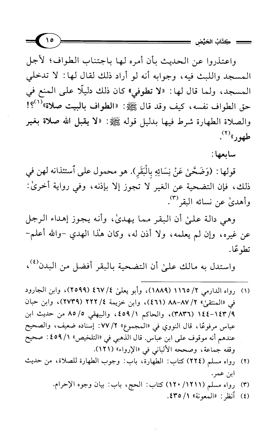 واعتذروا عن الحديث بأن أمره لها باجتناب الطواف؛ لأجل المسجد واللبث فيه، وجوابه أنه لو أراد ذلك لقال لها: لا تدخلي المسجد، ولما قال لها: "لا تطوفي" كان ذلك دليلًا على المنع في حق الطواف نفسه، كيف وقد قال - صلى الله عليه وسلم -: "الطواف بالبيت صلاة" (¬1)؟! والصلاة الطهارة شرط فيها بدليل قوله - صلى الله عليه وسلم -: "لا يقبل الله صلاة بغير طهور" (¬2).
