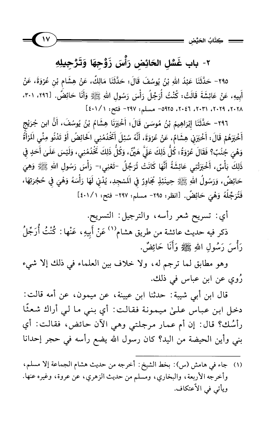 295 - حَدَّثَنَا عَبْدُ اللهِ بْن يُوسُفَ قَالَ: حَدَّثَنَا مَالِكٌ، عَنْ هِشَامِ بْنِ عُرْوَةَ، عَنْ أَبِيهِ، عَنْ عَائِشَةَ قَالَتْ: كُنْتُ أُرَجِّلُ رَأْسَ رَسُولِ اللهِ - صلى الله عليه وسلم - وَأَنَا حَائِضٌ. [296، 301، 2028، 2029، 2031، 2046، 5925 - مسلم: 297 - فتح: 1/ 401]