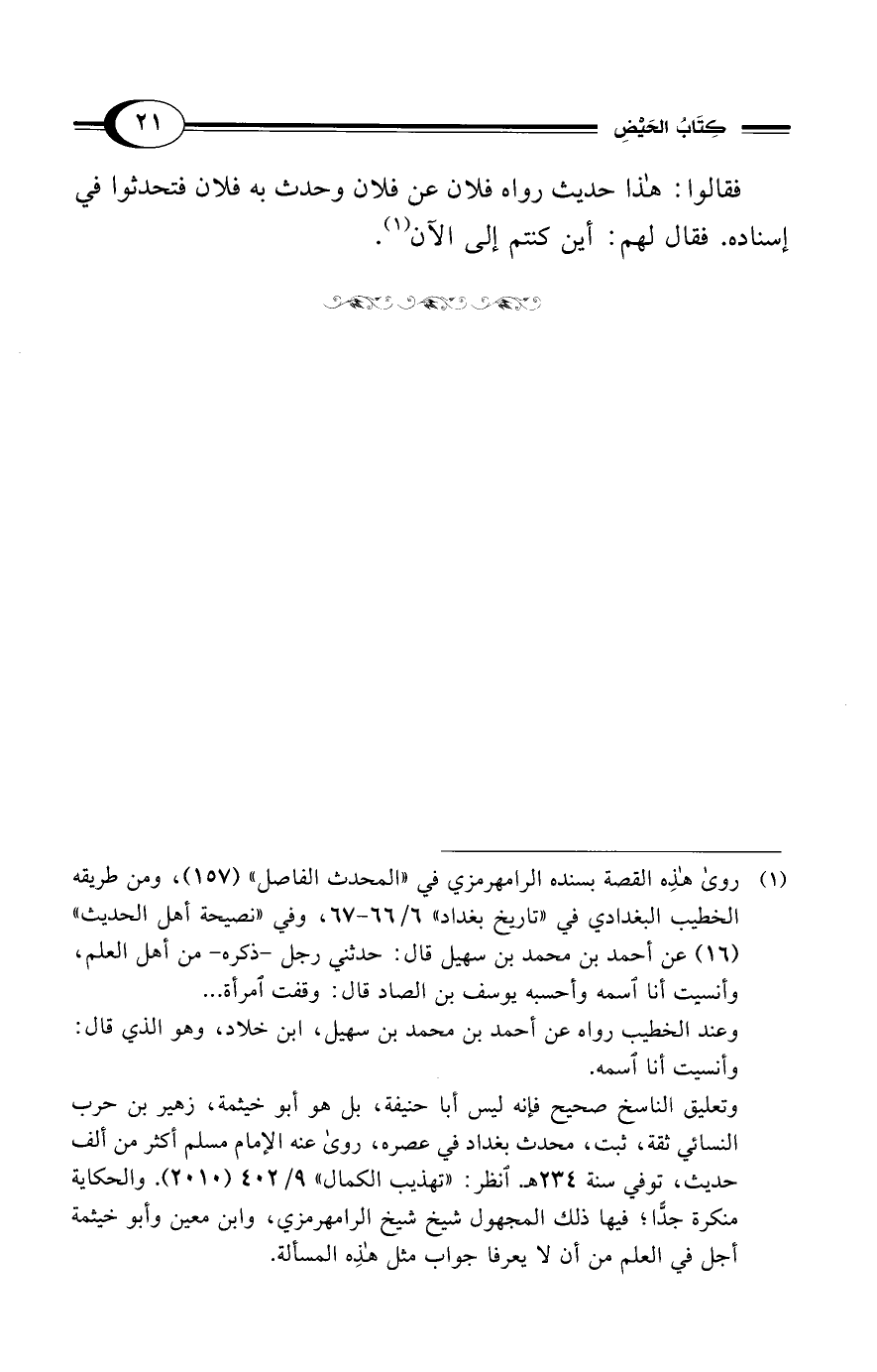 وتعليق الناسخ صحيح فإنه ليس أبا حنيفة، بل هو أبو خيثمة، زهير بن حرب النسائي ثقة، ثبت، محدث بغداد في عصره، روى عنه الإمام مسلم أكثر من ألف حديث، توفي سنة 234 هـ. انظر: "تهذيب الكمال" 9/ 402 (2010). والحكاية منكرة جدًّا؛ فيها ذلك المجهول شيخ شيخ الرامهرمزي، وابن معين وأبو خيثمة أجل في العلم من أن لا يعرفا جواب مثل هذِه المسألة.