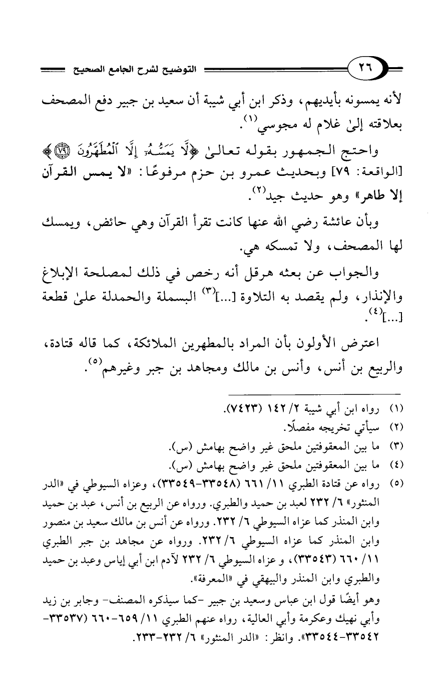 اعترض الأولون بأن المراد بالمطهرين الملائكة، كما قاله قتادة، والربيع بن أنس، وأنس بن مالك ومجاهد بن جبر وغيرهم (¬5).