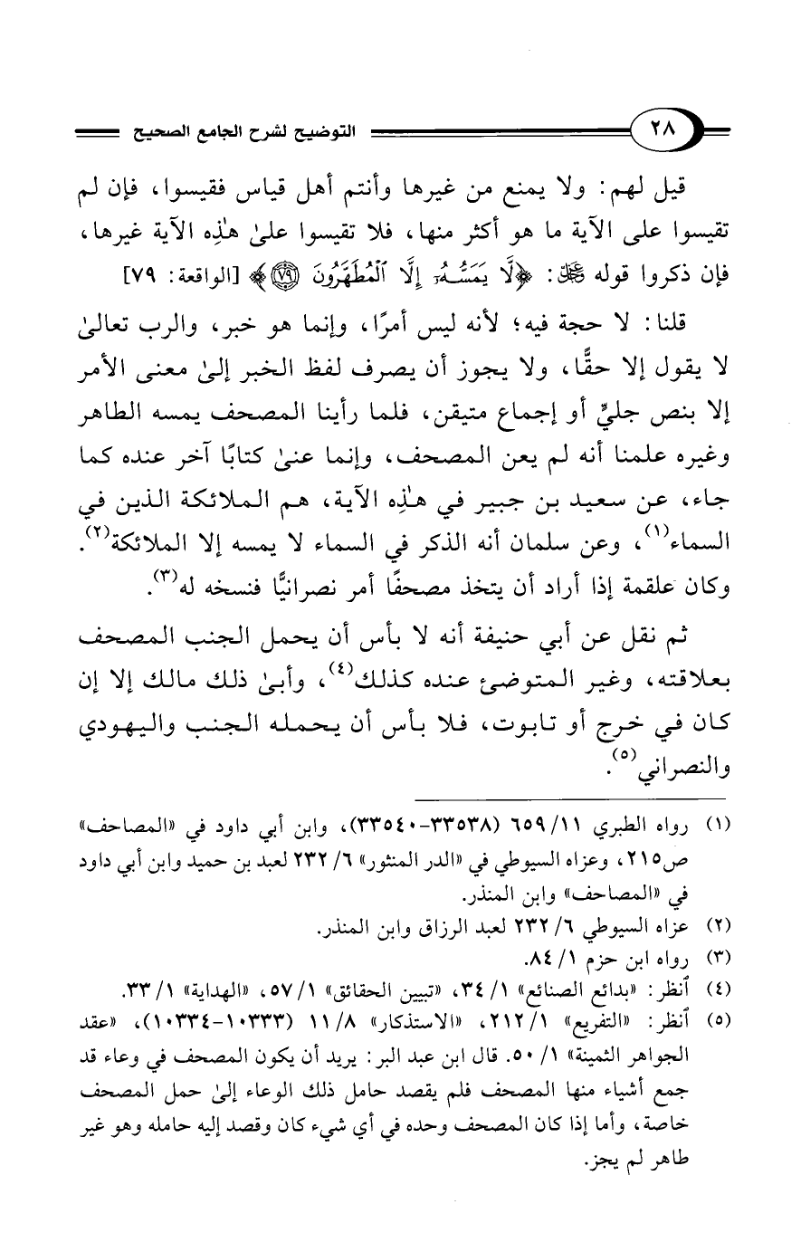 قيل لهم: ولا يمنع من غيرها وأنتم أهل قياس فقيسوا، فإن لم تقيسوا على الآية ما هو أكثر منها، فلا تقيسوا على هذِه الآية غيرها، فإن ذكروا قوله -عز وجل-: {لَا يَمَسُّهُ إِلَّا الْمُطَهَّرُونَ (79)} [الواقعة: 79]