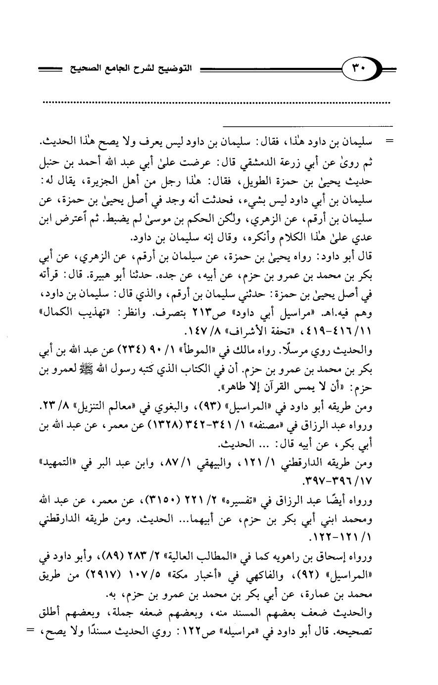قال أبو داود: رواه يحيى بن حمزة، عن سيلمان بن أرقم، عن الزهري، عن أبي بكر بن محمد بن عمرو بن حزم، عن أبيه، عن جده. حدثنا أبو هبيرة. قال: قرأته في أصل يحيى بن حمزة: حدثني سليمان بن أرقم، والذي قال: سليمان بن داود، وهم فيه. اهـ. "مراسيل أبي داود" ص 213 بتصرف. وانظر: "تهذيب الكمال" 11/ 416 - 419، "تحفة الأشراف" 8/ 147.