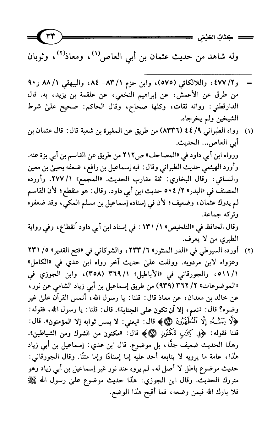 (¬2) أورده السيوطي في "الدر المنثور" 6/ 233، والشوكاني في "فتح القدير" 5/ 231 وعزواه لابن مردويه. ووقفت على حديث آخر رواه ابن عدي في "الكامل" 1/ 511، والجورقاني في "الأباطيل" 1/ 369 (358)، وابن الجوزي في "الموضوعات" 2/ 362 (939) من طريق إسماعيل بن أبي زياد الشامي عن نور، عن خالد بن معدان، عن معاذ قال: قلنا: يا رسول الله، أنمس القرآن على غير وضوء؟ قال: "نعم، إلا أن نكون على الجنابة". قال: قلنا: يا رسول الله، فقوله: {لَا يَمَسُّهُ إِلَّا الْمُطَهَّرُونَ (79)} قال: "يعني: لا يمس ثوابه إلا المؤمنون". قال: قلنا فقوله: {فِي كِتَابٍ مَكْنُونٍ (78)} قال: "مكنون من الشرك ومن الشياطين". وهذا الحديث ضعيف جدًّا، بل موضوع. قال ابن عدي: إسماعيل بن أبي زياد هذا، عامة ما يرويه لا يتابعه أحد عليه إما إسنادًا وإما متنًا. وقال الجورقاني: حديث موضوع باطل لا أصل له، لم يروه عند نور غير إسماعيل بن أبي زياد وهو متروك الحديث. وقال ابن الجوزي: هذا حديث موضوع على رسول الله - صلى الله عليه وسلم - فلا بارك الله فيمن وضعه، فما أقبح هذا الوضع.