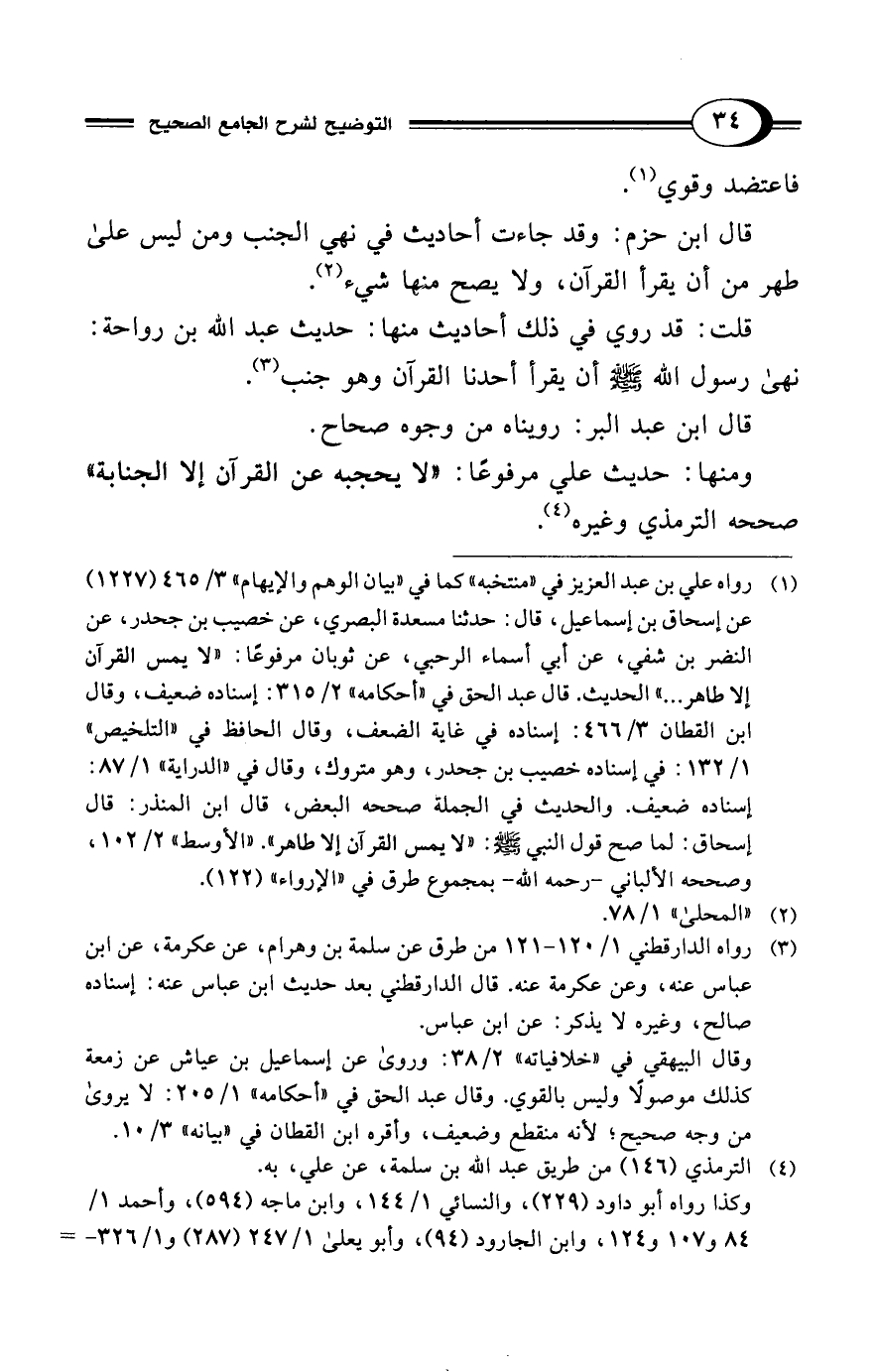ومنها: حديث علي مرفوعًا: "لا يحجبه عن القرآن إلا الجنابة" صححه الترمذي وغيره (¬4).