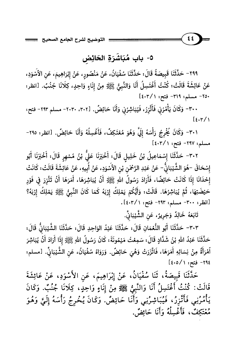 300 - وَكَانَ يَأْمُرُنِى فَأتَّزِرُ، فَيُبَاشِرُنِي وَأَنَا حَائِضٌ [302، 2030 - مسلم 293 - فتح: 1/ 403]