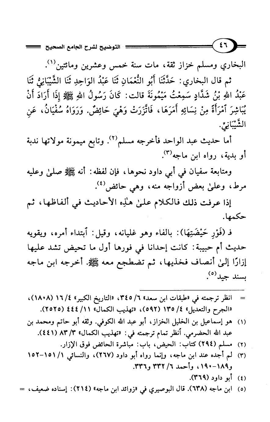 ثم قال البخاري: حَدَّثنَا أَبُو النُّعْمَانِ ثنَا عَبْدُ الوَاحِدِ ثنَا الشَّيْبَانِيُّ ثَنَا عَبْدُ اللهِ بْنُ شَدَّادٍ سَمِعْتُ مَيْمُونَةَ قالت: كَانَ رَسُولُ اللهِ - صلى الله عليه وسلم - أَرَادَ أَنْ يُبَاشِرَ امْرَأَةً مِنْ نِسَائِهِ أَمَرَهَا، فَاتَّزَرَتْ وَهْيَ حَائِضٌ. وَرَوَاهُ سُفْيَانُ، عَنِ الشَّيْبَانِيِّ.
