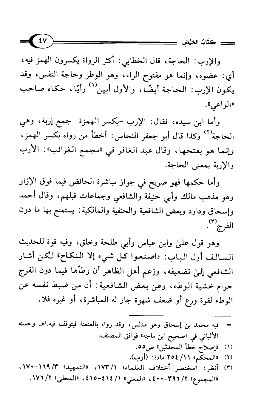 وأما حكمها فهو صريح في جواز مباشرة الحائض فيما فوق الإزار وهو مذهب مالك وأبي حنيفة والشافعي وجماعات قبلهم، وقال أحمد وإسحاق وداود وبعض الشافعية والحنفية والمالكية: يستمتع بها ما دون الفرج (¬3).