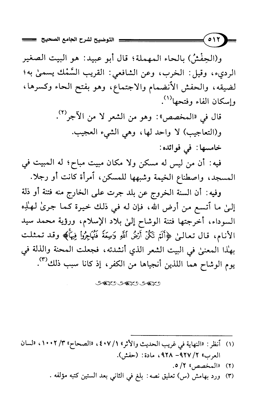 (¬1) انظر: "النهاية في غريب الحديث والأثر" 1/ 407، "الصحاح" 3/ 1002، "لسان العرب" 2/ 927 - 928، مادة: (حفش).