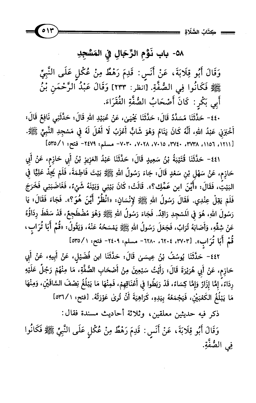441 - حَدَّثَنَا قُتَيبَةُ بْنُ سَعِيدٍ قَالَ: حَدَّثَنَا عَبْدُ العَزِيزِ بن أَبِي حَازِمِ، عَنْ أَبِي حَازِمٍ، عَنْ سَهْلِ بْنِ سَعْدٍ قَالَ: جَاءَ رَسُولُ اللهِ - صلى الله عليه وسلم - بَيتَ فَاطِمَةَ، فَلَمْ يَجِدْ عَلِيًّا فِي البَيْتِ، فَقَالَ: "أَيْنَ ابن عَمَّكِ؟ ". قَالَتْ: كَانَ بَيْنِي وَبَيْنَهُ شَيْءٌ، فَغَاضَبَنِي فَخَرَجَ فَلَمْ يَقِلْ عِنْدِي. فَقَالَ رَسُولُ اللهِ - صلى الله عليه وسلم - لإِنْسَانِ: "انْظُرْ أَيْنَ هُوَ؟ ". فَجَاءَ فَقَالَ: يَا رَسُولَ اللهِ، هُوَ فِي الَمسْجِدِ رَاقِدٌ. فَجَاءَ رَسُولُ اللهِ - صلى الله عليه وسلم - وَهْوَ مُضْطَجِعٌ، قَدْ سَقَطَ رِدَاؤُهُ عَنْ شِقِّهِ، وَأَصَابَهُ تُرَابٌ، فَجَعَلَ رَسُولُ اللهِ - صلى الله عليه وسلم - يَمْسَحُهُ عَنْهُ، وَيَقُولُ: "قُمْ أَبَا تُرَابٍ، قُمْ أَبَا تُرَابٍ". [3703، 6204، 6280 - مسلم: 2409 - فتح: 1/ 535]