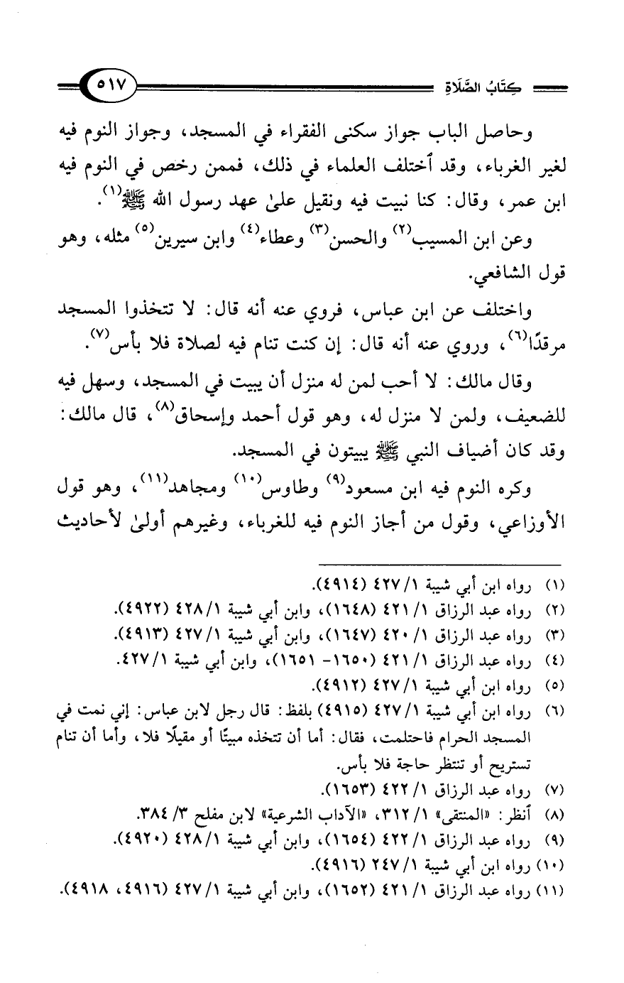 (¬6) رواه ابن أبي شيبة 1/ 427 (4915) بلفظ: قال رجل لابن عباس: إني نمت في المسجد الحرام فاحتلمت، فقال: أما أن تتخذه مبيتًا أو مقيلًا فلا، وأما أن تنام تستريح أو تنتظر حاجة فلا بأس.